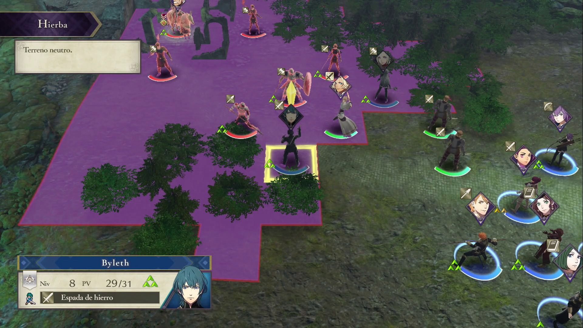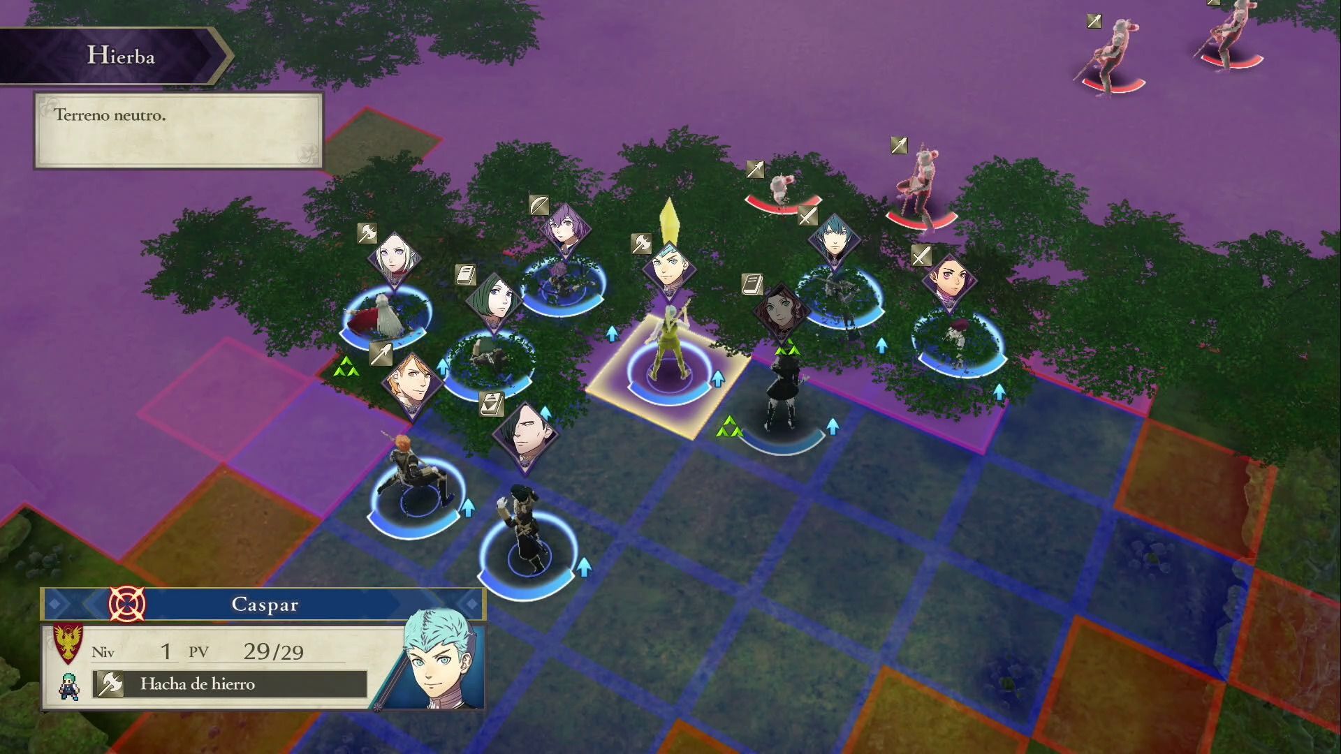 Lo más interesante es que lo que aprenden no depende únicamente de la destreza que mejoren, sino del propio personaje. Por ejemplo, podemos subir razón a rango D con dos unidades distintas, y mientras una adquiere el hechizo de Fuego, otra aprende Ciénaga. Esto consigue darle un toque muy personal y único a cada uno de los protagonistas, algo que se ve potenciado por los Emblemas (unas pasivas exclusivas que tienen algunos héroes y que se activan de diferentes maneras durante los enfrentamientos) y su habilidad personal única.