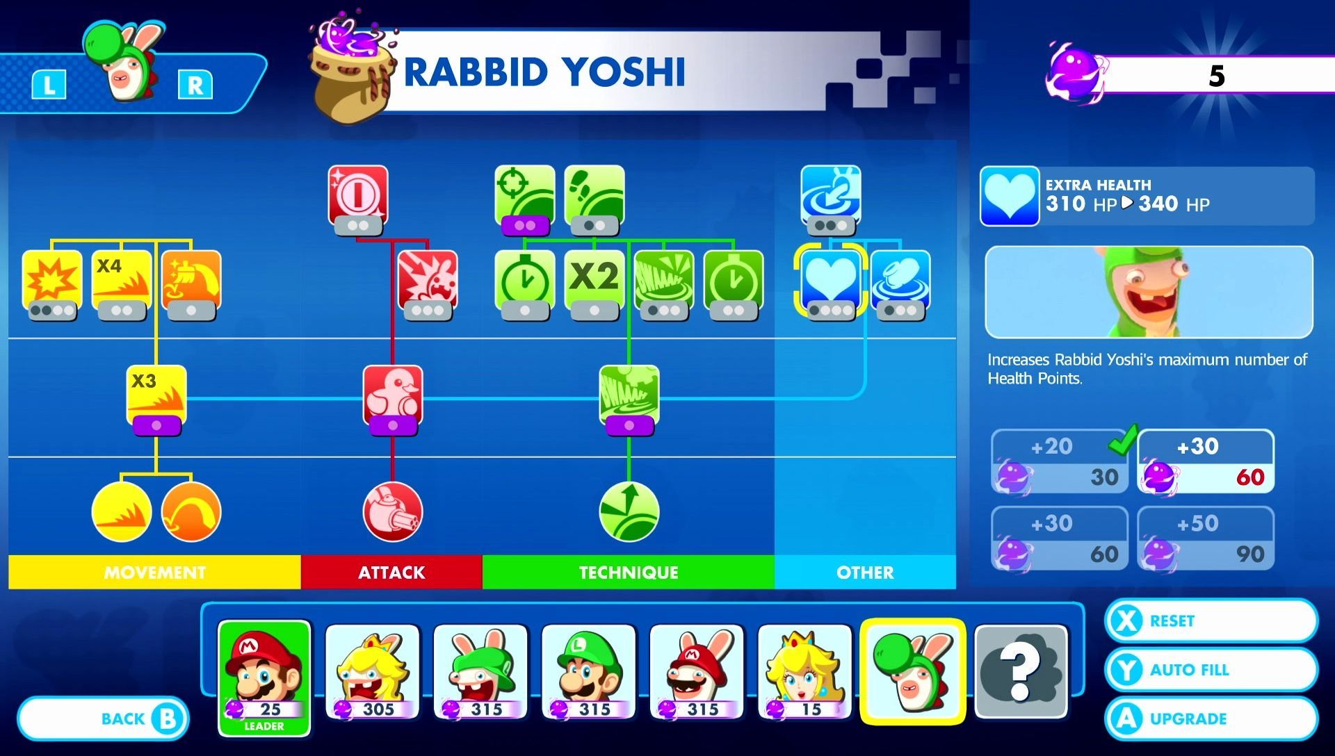 Aunque no lo vamos a comparar con los referentes del género, Mario + Rabbids Kingdom Battle es un juego bastante profundo. Hay mil y una combinaciones posibles para formar nuestro equipo y su equipamiento, con arma primaria, secundaria y dos habilidades, así como un árbol de habilidades para añadir todavía más complejidad. Y todo esto luego hay que aplicarlo en el campo de batalla, lo que deja las puertas abiertas a más opciones.