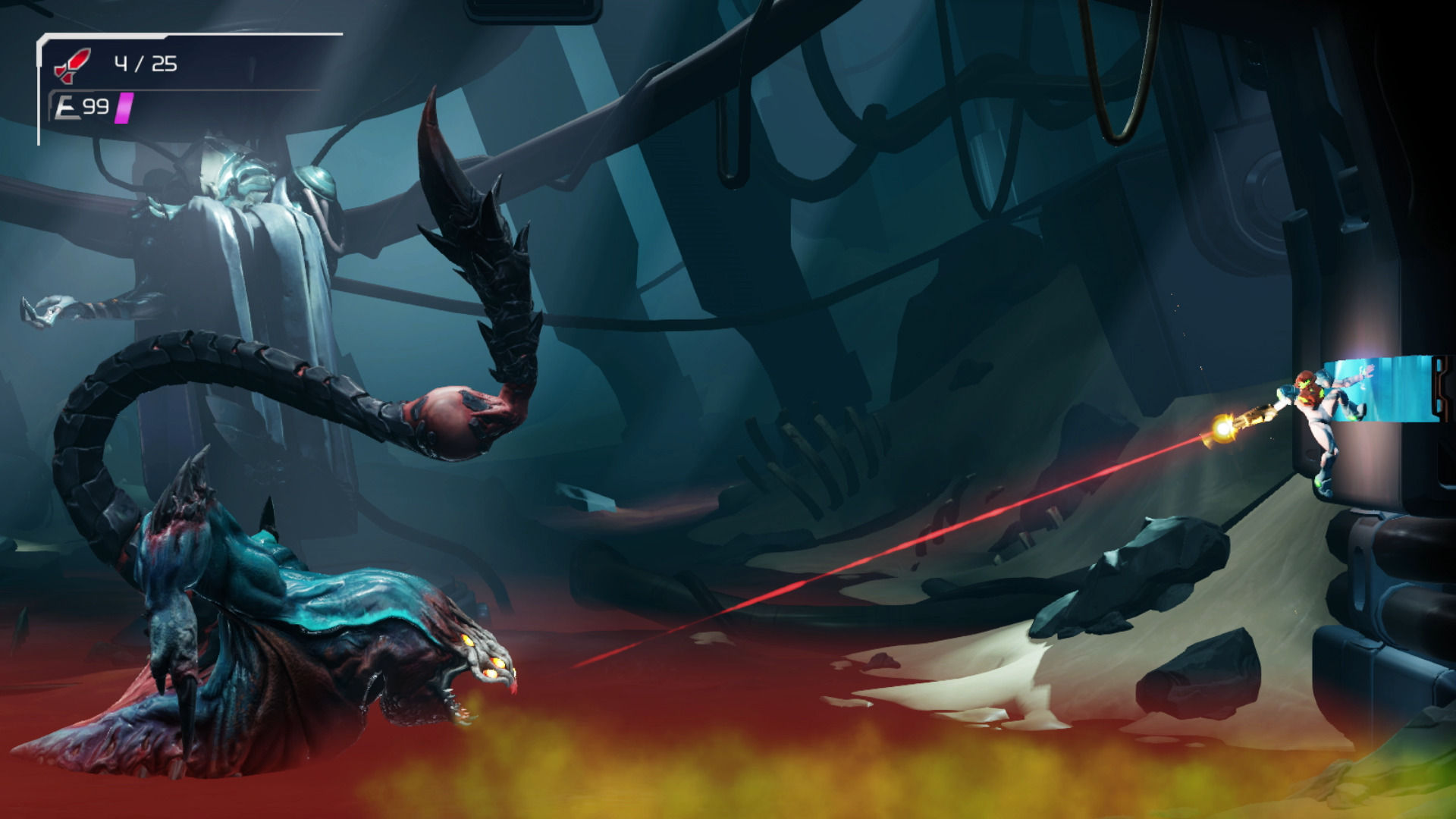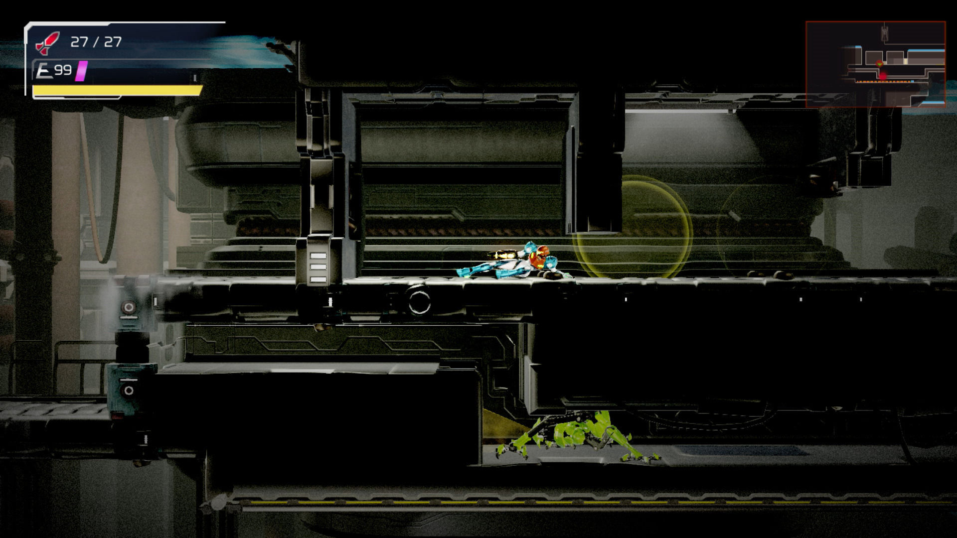 De hecho, si el primer jefe final es representativo de los demás, parece que el reto no serán los bosses sino los E.M.M.I. Se trata de una mezcla gigante de lagarto y escorpión capaz de hacerse invisible y con los puntos débiles bien marcados. Hay que esquivar proyectiles y coletazos, y agarrarse a los salientes para dispararle desde las alturas. Un enfrentamiento sencillo, pero vistoso en su puesta en escena: podemos contraatacar algunos de sus movimientos después de deslizarnos bajo sus pies.