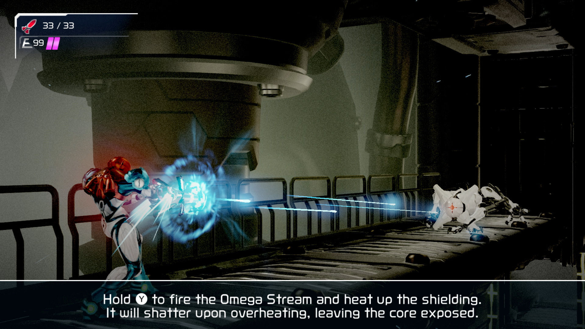 Eso sí, no son invencibles. En las mismas áreas en las que se encuentran podemos conseguir el cañón omega, pero probablemente el juego nos obligará a entrar y salir de la zona en varias ocasiones para resolver puzles o desbloquear accesos alternativos antes de hacernos con él. Incluso el momento de acabar con ellos es tenso: la perspectiva cambia a una cámara casi al hombro, y mientras el E.M.M.I. avanza hacia nosotros, debemos apuntar a su única parte vulnerable, el visor. Una vez derrotado, el cañón vuelve a su estado natural.