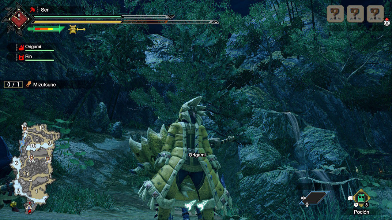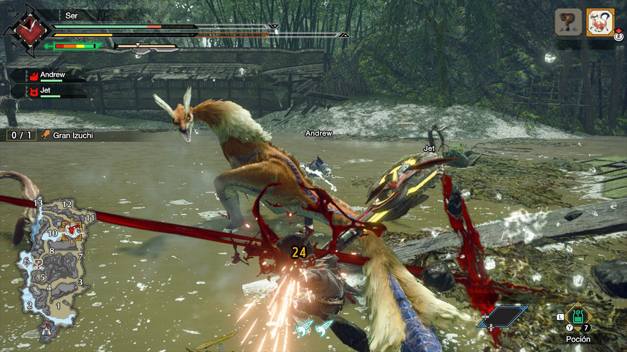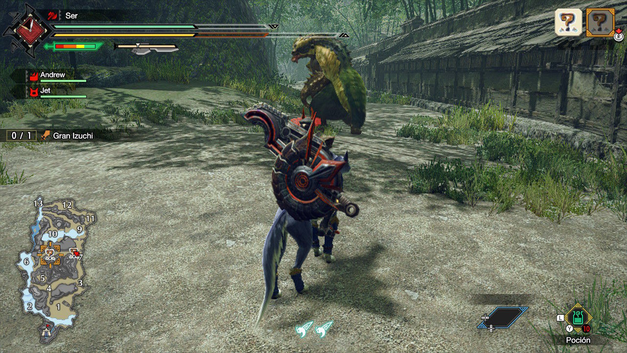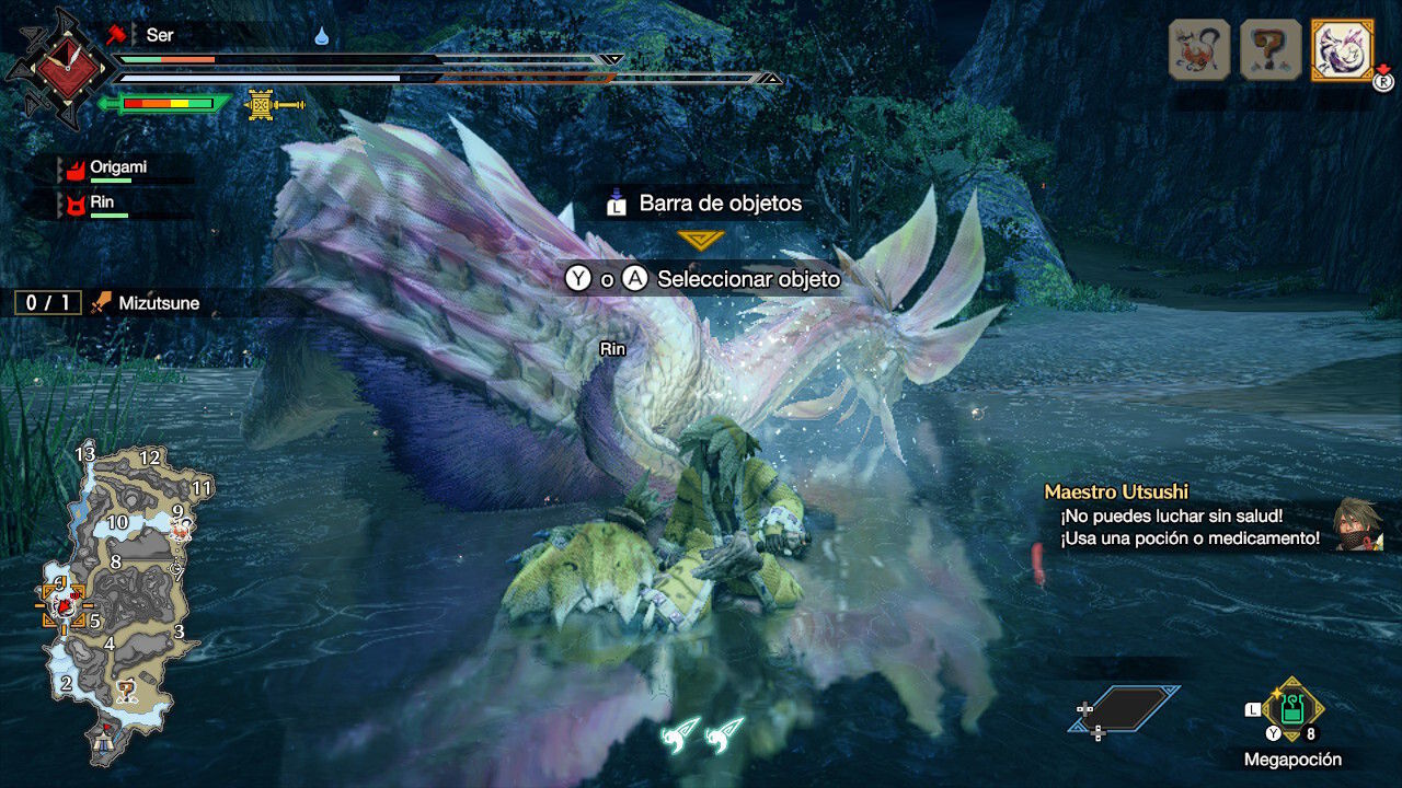 Para todos aquellos que no lo han probado todavía, la demo nos permite acceder de inicio a cuatro tareas diferentes. Dos de ellas son tutoriales, uno básico en el que se nos enseñan los pormenores sobre la cacería de monstruos y otro que nos muestra todo lo que hay que saber para usar monturas de criaturas wyvern. Unas enseñanzas que nos son reveladas por el gran maestro Utsushi… y en español, dado que el título puede ser disfrutado con textos en nuestro idioma y voces en inglés, japonés o, lo mejor de todo, en el idioma de Monster Hunter. Pero más chicha tienen las dos misiones de caza que nos permite llevar a cabo dicha demo. La primera de ellas, la más fácil, nos anima a salir a cazar a un Gran Izuchi (una bestia inédita en la franquicia hasta ahora), mientras que la segunda (catalogada como de nivel intermedio) nos brinda la ocasión de reducir a un siempre temible Mizutsune. Ambas misiones pueden ser desempeñadas tanto en solitario como en compañía de otros cazadores online, aunque esta última opción apenas hemos podido probarla debido a que era casi imposible encontrar partidas activas a la hora de escribir estas líneas… si bien lo poco que disfrutamos de este modo nos pareció bastante solvente y no sufrimos demasiados problemas de tipo técnico. Eso sí, la demo únicamente nos permite salir de caza un número limitado de veces, 30, cantidad más que suficiente para hacerse una idea muy certera sobre el funcionamiento, prestaciones y mecánicas de esta obra.