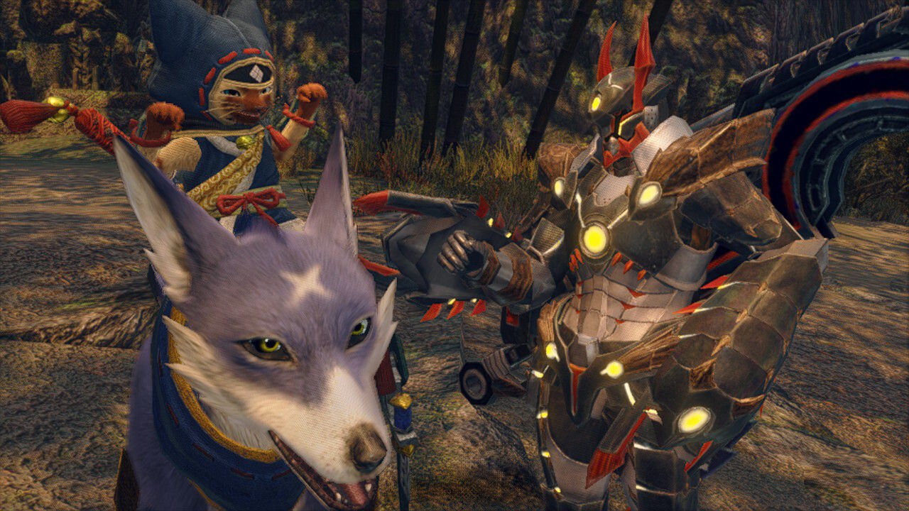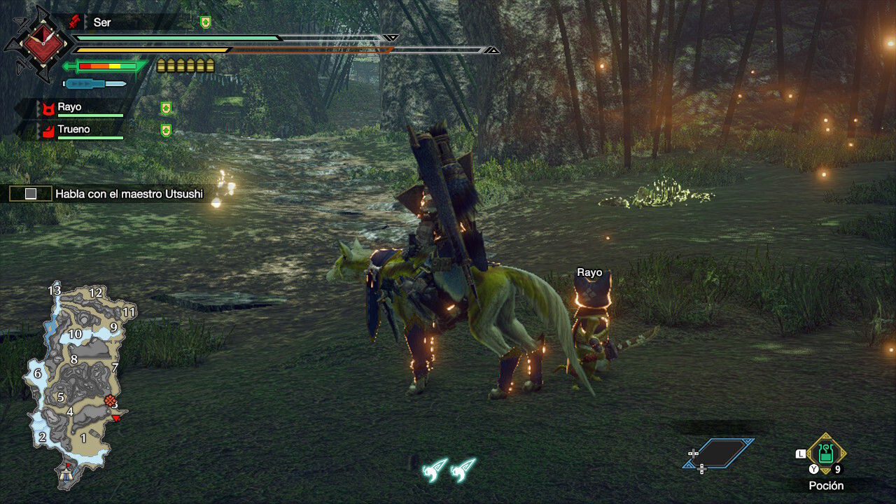 Estas mascotas nos han parecido realmente útiles, hasta el punto de que una vez te acostumbras a ellas, no entiendes cómo no se les ha ocurrido antes a los desarrolladores de la saga incluirlos en entregas precedentes. Así, la mayor parte del tiempo que viajábamos de un lado a otro del enorme escenario, lo hacíamos a lomos de nuestro querido animalito. Y aunque parezca una tontería, lo cierto es que ir montados en los Canyne nos pareció tan placentero como útil, sobre todo a la hora de perseguir con mayor celeridad a las bestias que trataban de escapar (como el Gran Izuchi en nuestro enfrentamiento contra él) de la batalla cuando se encontraban en problemas. Una vez montados sobre ellos era posible efectuar diversas acciones, como recoger materias primas (miel, hierbas curativas para elaborar pociones, etc.) o, incluso, atacar a los adversarios… aunque causábamos menos daño. De esta forma, lo más recomendable era llegar hasta ellos cabalgando en nuestra montura pero, una vez daba comienzo el enfrentamiento, nos desmontábamos para ganar en capacidad ofensiva, dado que de esta forma el Canyne también era capaz de atacar por su cuenta a nuestros oponentes. Un aliado fantástico que, estamos convencidos, de ahora en adelante se convertirá en una constante en futuras entregas de esta franquicia.
