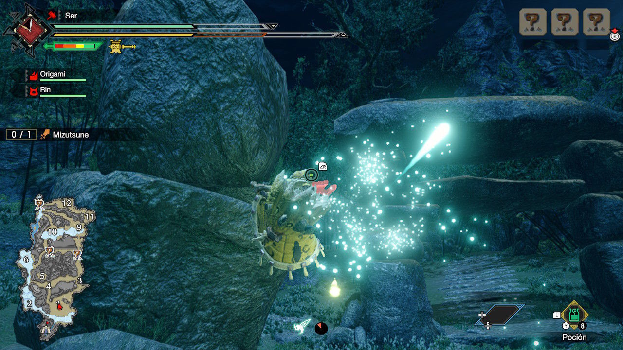 Centrándonos ya en los enfrentamientos, lo cierto es que nos han parecido realmente interesantes. Una vez más cada personaje contará con su propio set de movimientos y ataques, pudiendo también realizar maniobras de evasión y rodar por el suelo. Cada vez que efectuemos alguna de ellas (incluyendo correr de un lado a otro), la barra de resistencia irá reduciéndose, por lo que nuevamente será necesario estar muy pendientes de dicho indicador. Nos ha convencido plenamente el comportamiento de las bestias, las cuales no dudaban en enfrentarse unas con otras mientras deambulaban por los fondos o, por supuesto, pedir refuerzos siempre que les era posible. El Gran Izuchi, por ejemplo, siempre trataba de reclutar a varios súbditos para ayudarle en las peleas, criatura que por otro lado no dudó un instante en huir de nosotros en cuanto vio que las cosas se le complicaban. Más épico fue el combate contra Mizutsune, el cual no paraba de lanzar sus famosas burbujas inmovilizadoras desde la distancia para, después, atacarnos con ferocidad. Unas batallas que nos parecieron realmente magníficas y que nos han servido para hacernos una idea bastante cercana de lo que puede depararnos esta aventura en su versión final, la cual llegará el 26 de marzo.