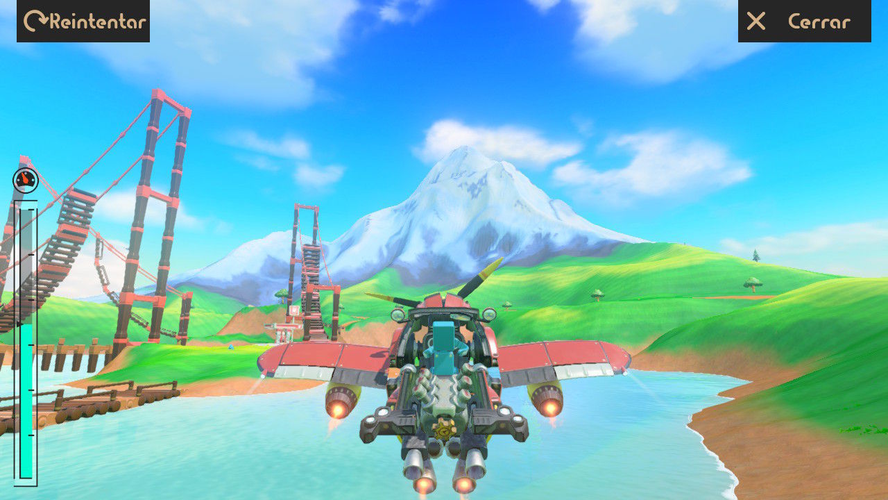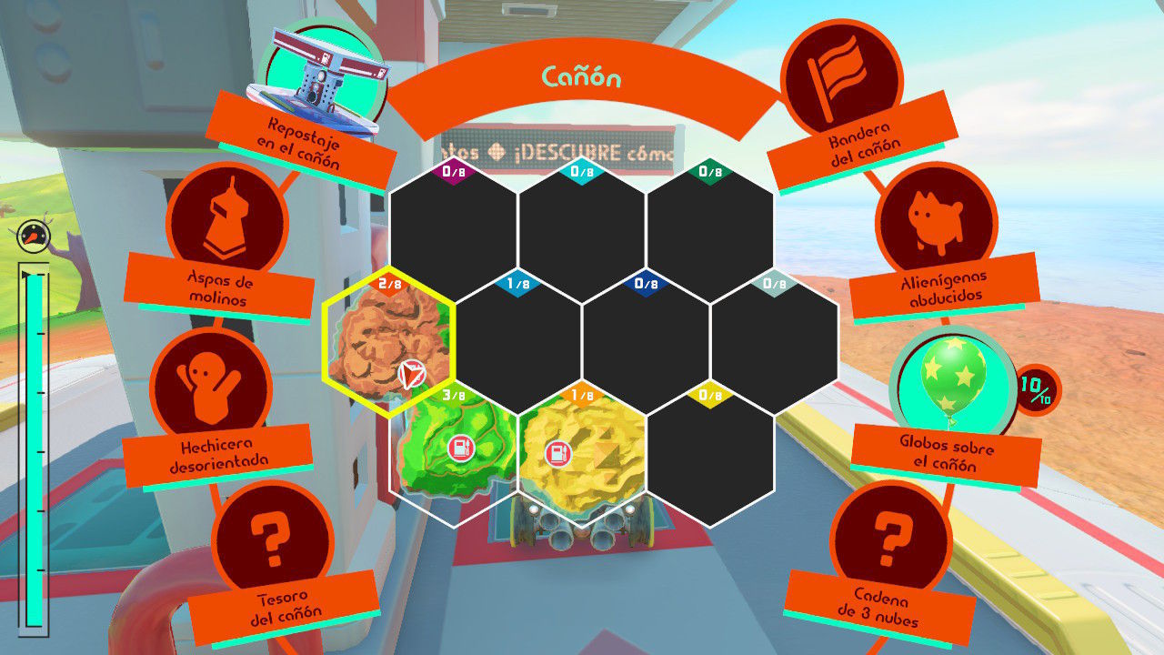 Pero el verdadero alma de las opciones de juego es el modo Aventura, un mapa formado por diez hexágonos de distintos biomas que se puede recorrer en coche, avión o vehículo marítimo. Cada uno de los hexágonos tiene distintas misiones que van desde acabar con serpientes o estallar globos con misiles a encontrar cofres del tesoro, talar árboles, recoger unas vacas o colocar las aspas en un molino. En cualquier momento intercambiamos de vehículo lo que hace que este modo sea realmente entretenido. Para guardar hay que ir a una gasolinera conduciendo un coche y repostar allí.