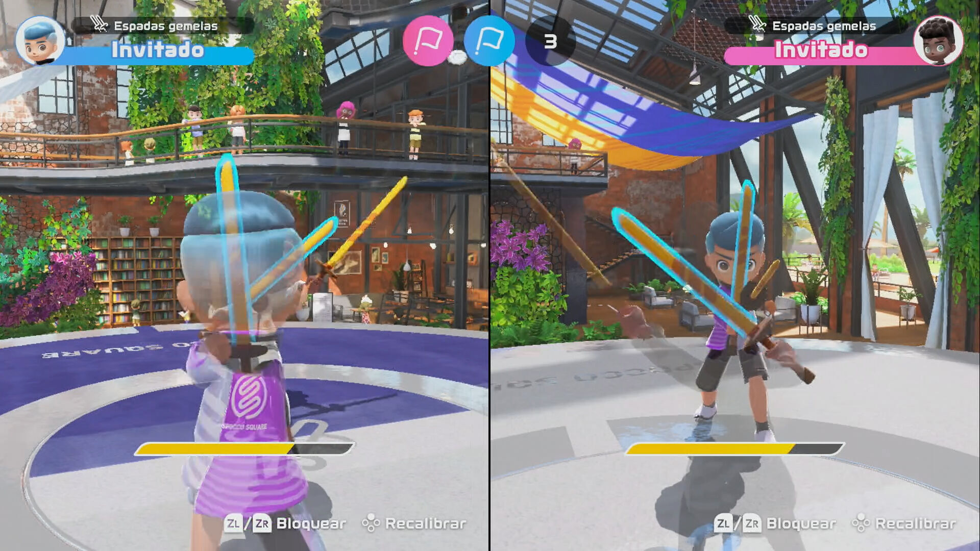 En cuanto al chambara, es una adaptación y evolución del kendo de Wii Sports Resort. Armados con una espada de gomaespuma que replica nuestros movimientos con un solo Joy-Con, el objetivo es golpear al rival (y bloquear sus ataques, claro) para tirarlo de la plataforma en la que combatimos. Es el juego más dinámico y tenso del conjunto, un equivalente al boxeo de la primera entrega de la serie, pero más preciso y entendible. Y con el oponente adecuado, uno de los más divertidos y cansados. Pero más allá del cambio de nombre, hay otros cambios. Ahora se puede utilizar una espada normal o una de energía; la segunda pega menos fuerte, pero al bloquear ataques se carga y permite hacer potentes ataques giratorios verticales y horizontales. Además, con dos Joy-Con se pueden usar espadas dobles de energía, que aportan dos cosas: primero, un toque estratégico extra, pues no se puede golpear ni defender con las dos a la vez, pero sí mover para amagar y confundir al rival; segundo, la genial posibilidad de fliparse de manera ridícula frente a la pantalla.
