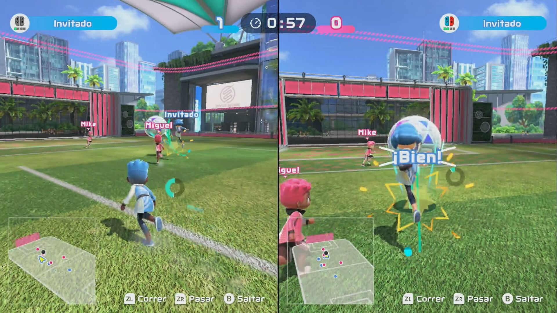 Por último, el fútbol, el deporte que probablemente cause más discrepancias entre unos y otros jugadores. Evidentemente, no es un simulador de ningún tipo, sino que se inspira en Rocket League para poner en el estadio un balón gigantesco con unas físicas un tanto alocadas. En el modo principal se puede jugar dos contra dos y cuatro contra cuatro (en local pueden jugar un máximo de dos en equipos adversarios o en el mismo). Son obligatorios dos Joy-Con por jugador, se usa la palanca para mover al avatar, los botones para saltar, correr y pasar, y el movimiento de los mandos para patear y golpear con la cabeza (con una animación bastante graciosa, todo sea dicho). Esa distribución de las acciones resta algo imprescindible de este juego: la accesibilidad, que cualquier persona pueda coger el mando y saber qué hacer sin demasiadas explicaciones. Pero además, el deporte en sí mismo es menos dinámico y divertido de lo que nos gustaría. Aunque quizá en multijugador online para ocho sea más entretenido.