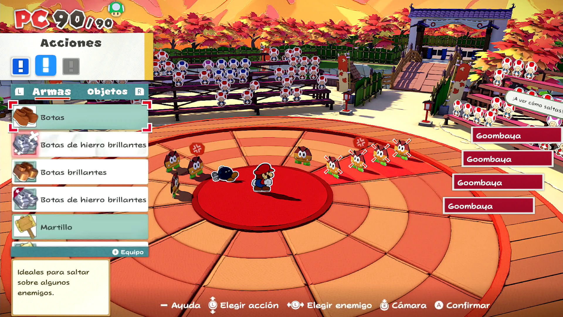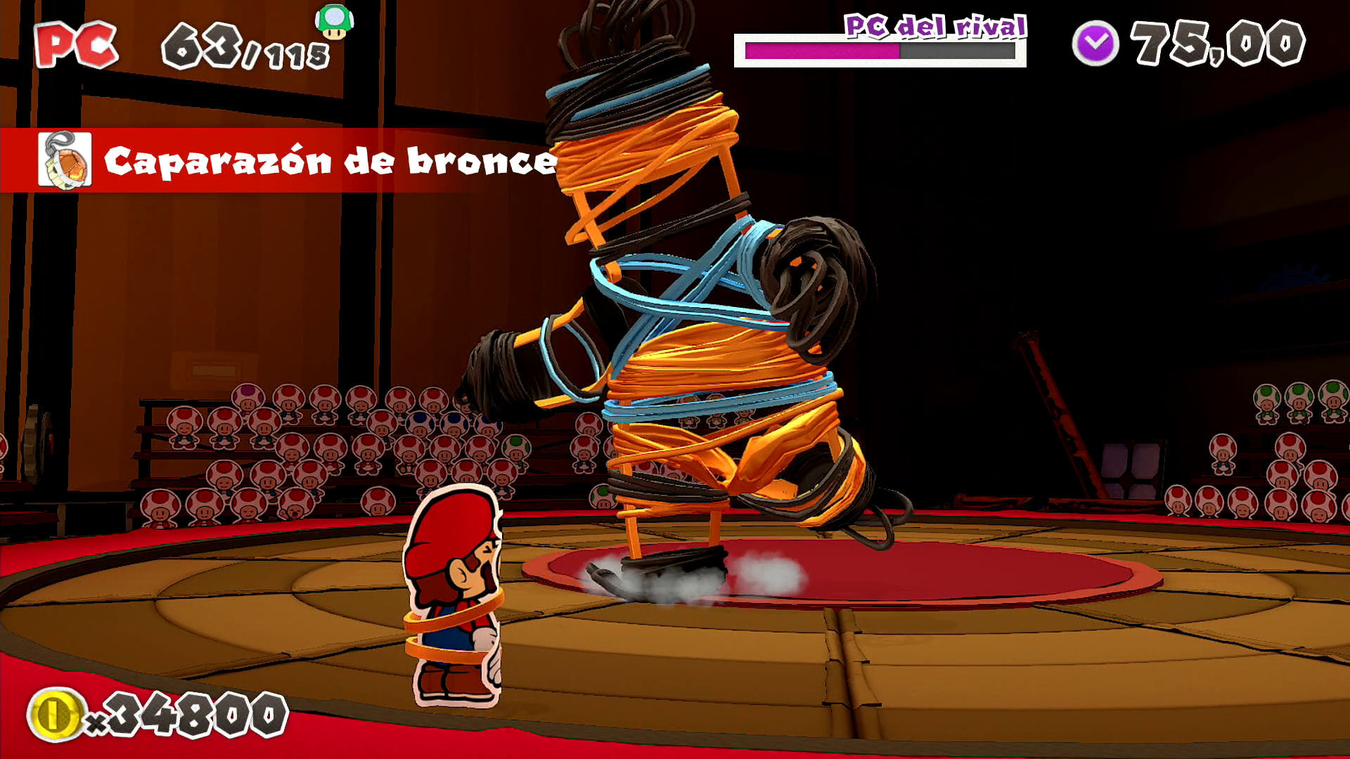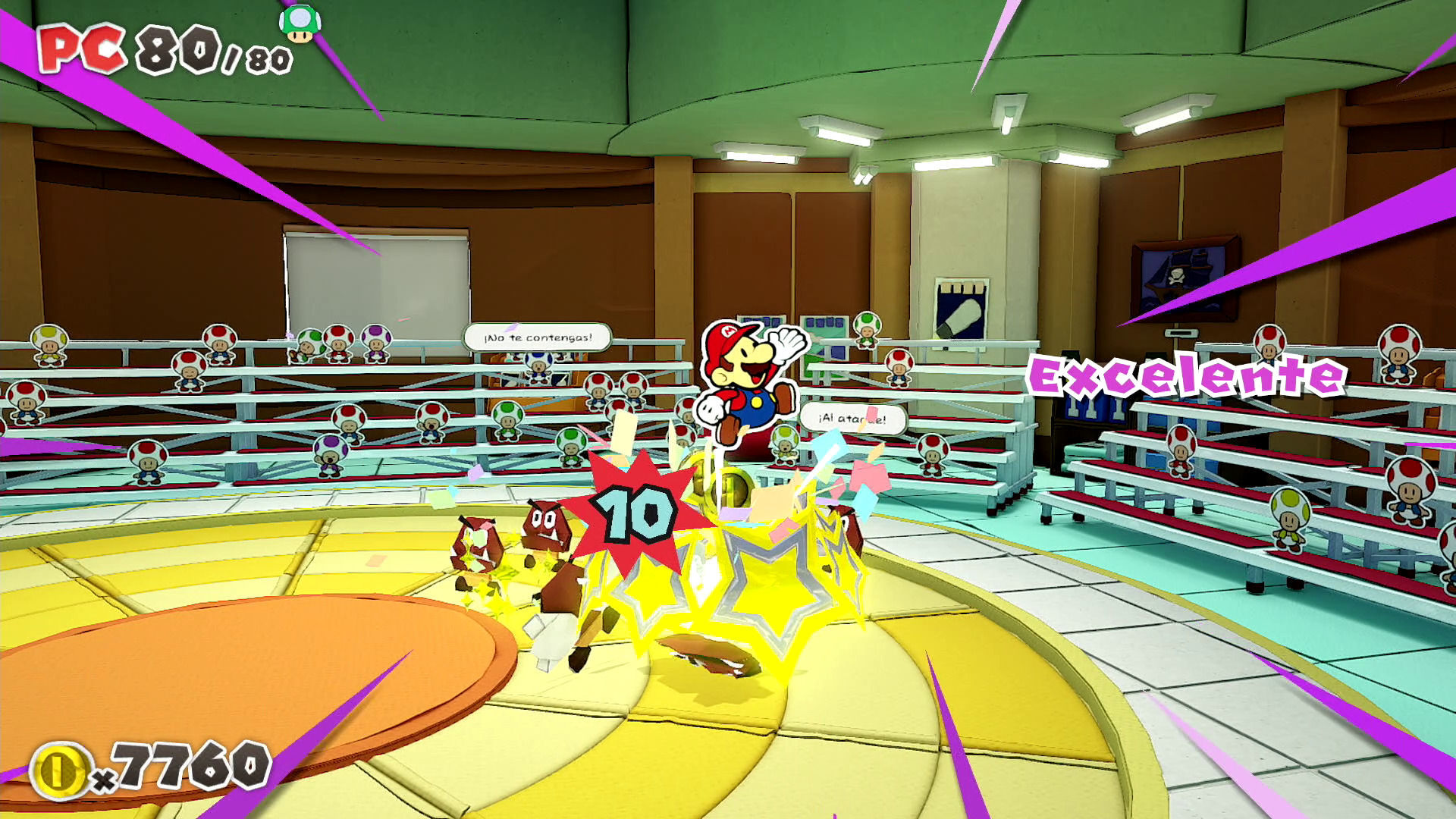 Otra cuestión que conviene abordar es la del sistema de progresión del juego. Tal y como os comentamos antes, el título dista mucho de ser un JRPG, por lo que no esperéis un sistema de experiencia y subidas de nivel tradicional, ya que no existe. Aquí combatir nos servirá para obtener monedas y confeti. Las primeras nos permitirán comprar todo tipo de cosas, solicitar la ayuda de los Toad en combate, aumentar el tiempo que tenemos para alinear enemigos en un turno y reponer nuestra reserva de armas, mientras que el confeti será necesario para tapar y reparar los agujeros que encontraremos por el escenario, algo necesario para acceder a muchos lugares que de otro modo estarían inaccesibles.