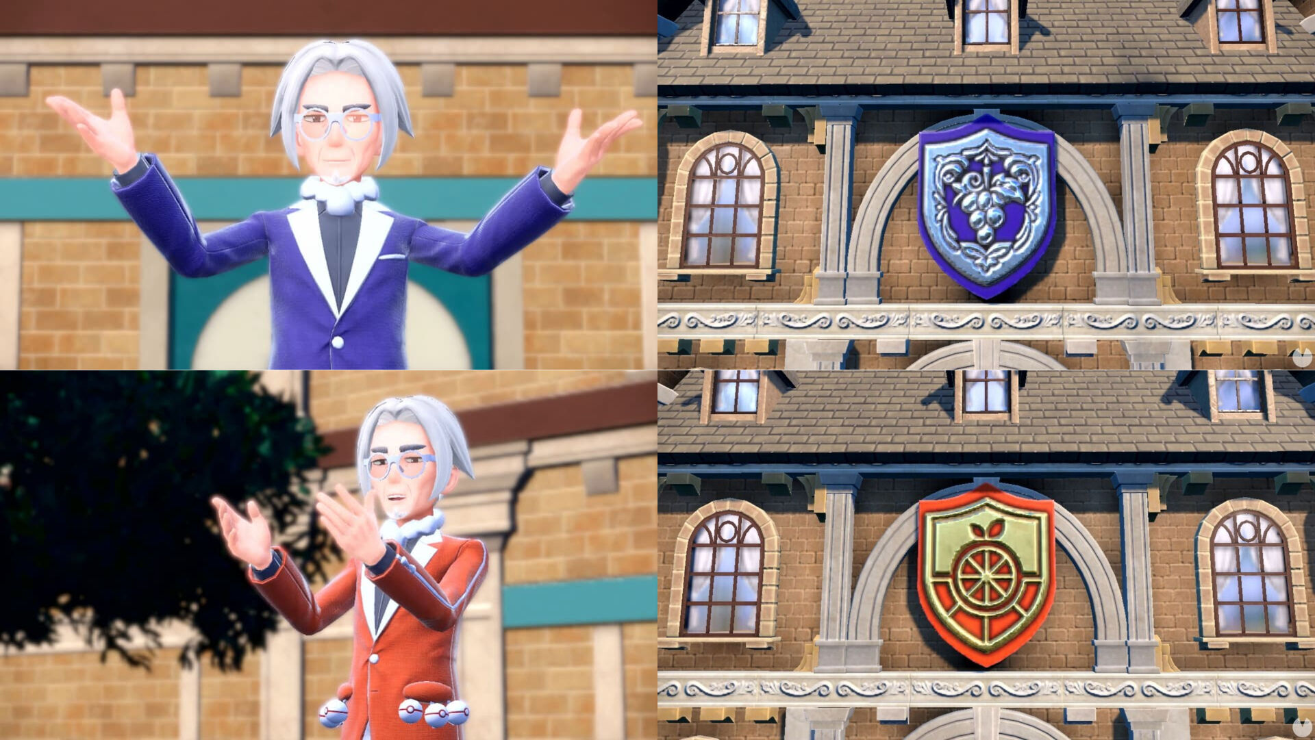 Como viene siendo tradición en todas las entregas duales de Pokémon, tanto Pokémon Escarlata como Pokémon Púrpura contarán con contenidos exclusivos, incluyendo personajes, Pokémon y ciertos eventos. Centrándonos en los protagonistas absolutos de las carátulas de ambos juegos, sabemos que Koraidon será el Pokémon legendario de Escarlata, mientras que Miraidon será el de Púrpura. Por otro lado, la Profesora Albora será exclusiva de Escarlata y el Profesor Turo sólo aparecerá en Púrpura, mientras que la Academia Naranja pertenecerá a Escarlata y la Uva a Púrpura.