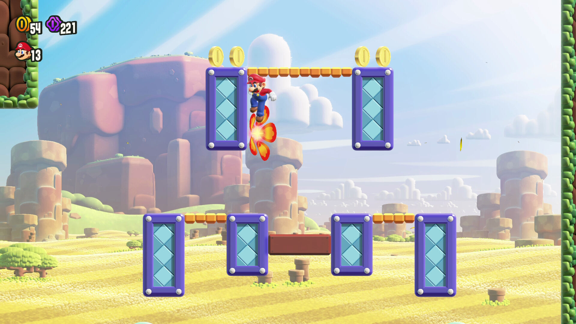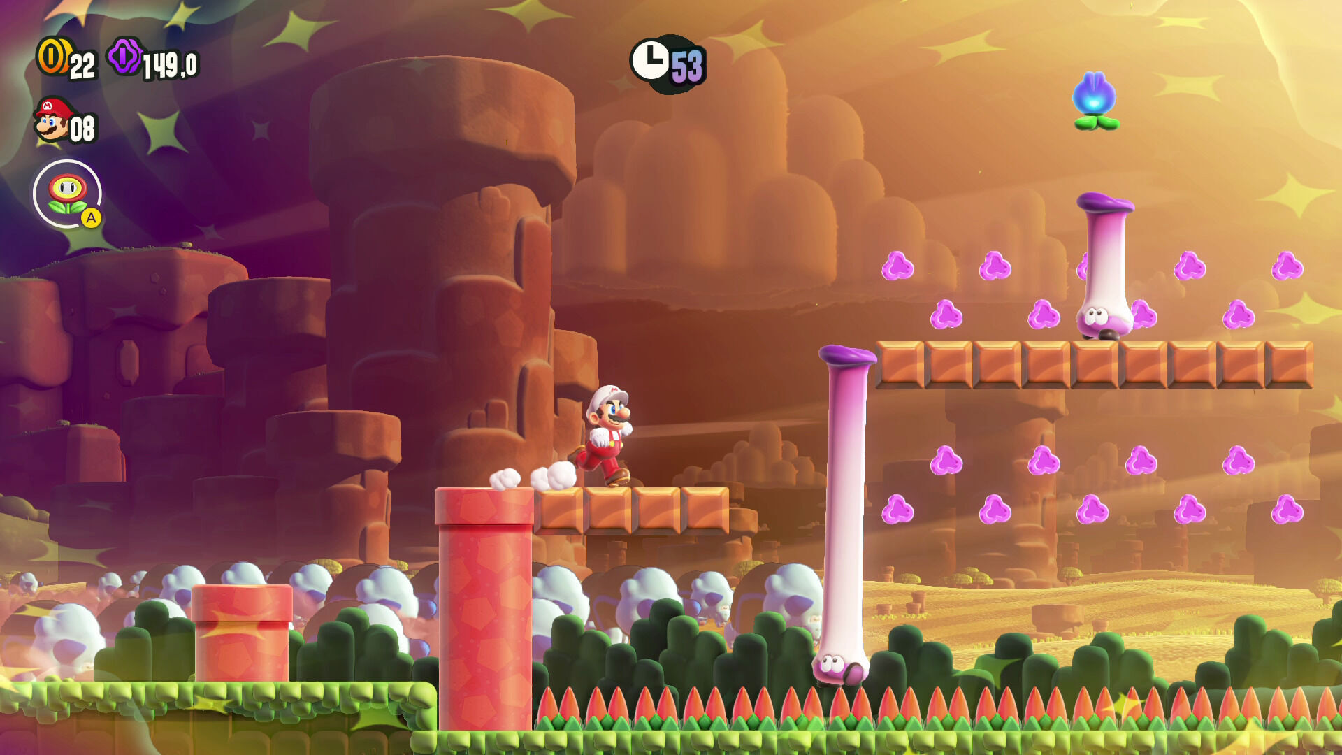 Por cierto, cada nivel esconde tres monedas grandes moradas y varias semillas maravilla y para dar con estos secretos vamos a tener que fijarnos muy bien en los escenarios e incluso resolver pequeños puzles integrados en el entorno que nos han resultado muy ingeniosos. Además, a veces hay salidas y rutas adicionales, y que demos con una u otra puede depender de si tocamos la flor maravilla de la fase o no, por lo que son muy rejugables si queremos hacernos con el 100 %.