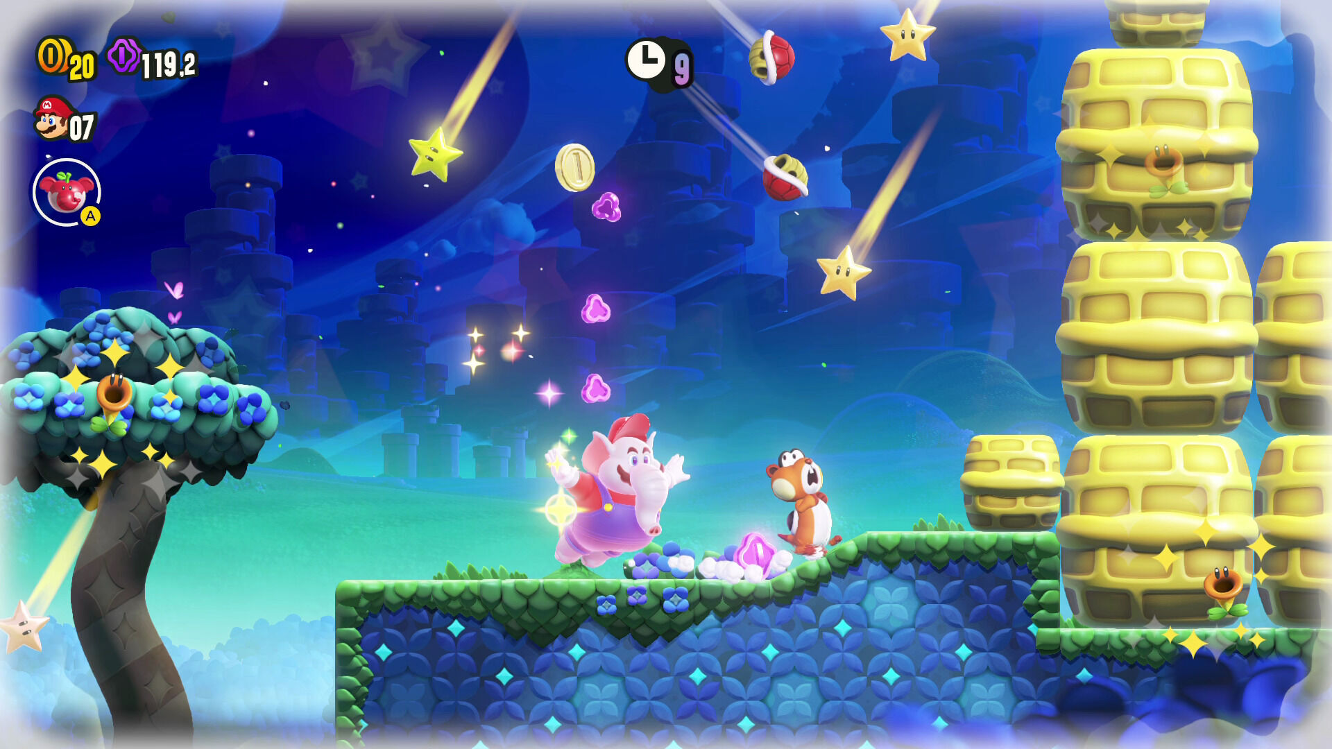 Tan pronto cobrarán vida las tuberías que nos perseguirá una estampida de embistontes o lloverán estrellas, por mencionar tan solo unos ejemplos. Nunca sabemos qué es lo que va a pasar cuando toquemos la flor maravilla de una fase por primera vez y todos los efectos que hemos visto nos han parecido tremendamente divertidos y sorprendentes, por lo que siempre estaremos deseando encontrarlas para ver qué nueva locura se les ha ocurrido. Puede que no lo parezca, pero conseguir esto con un juego de plataformas 2D tradicional en una época en la que parece que ya está todo inventado y no hay espacio para sorprender al jugador con nuevas ideas es algo que tiene un mérito enorme.