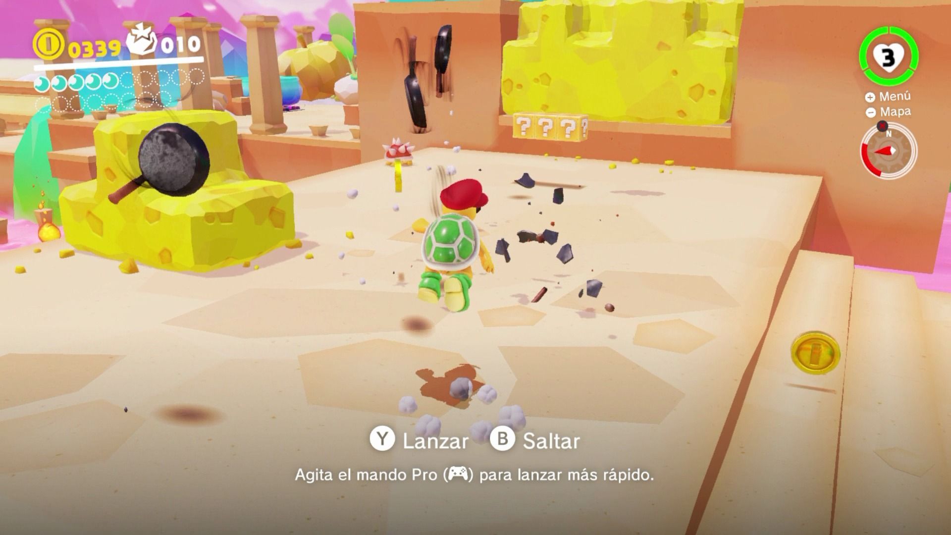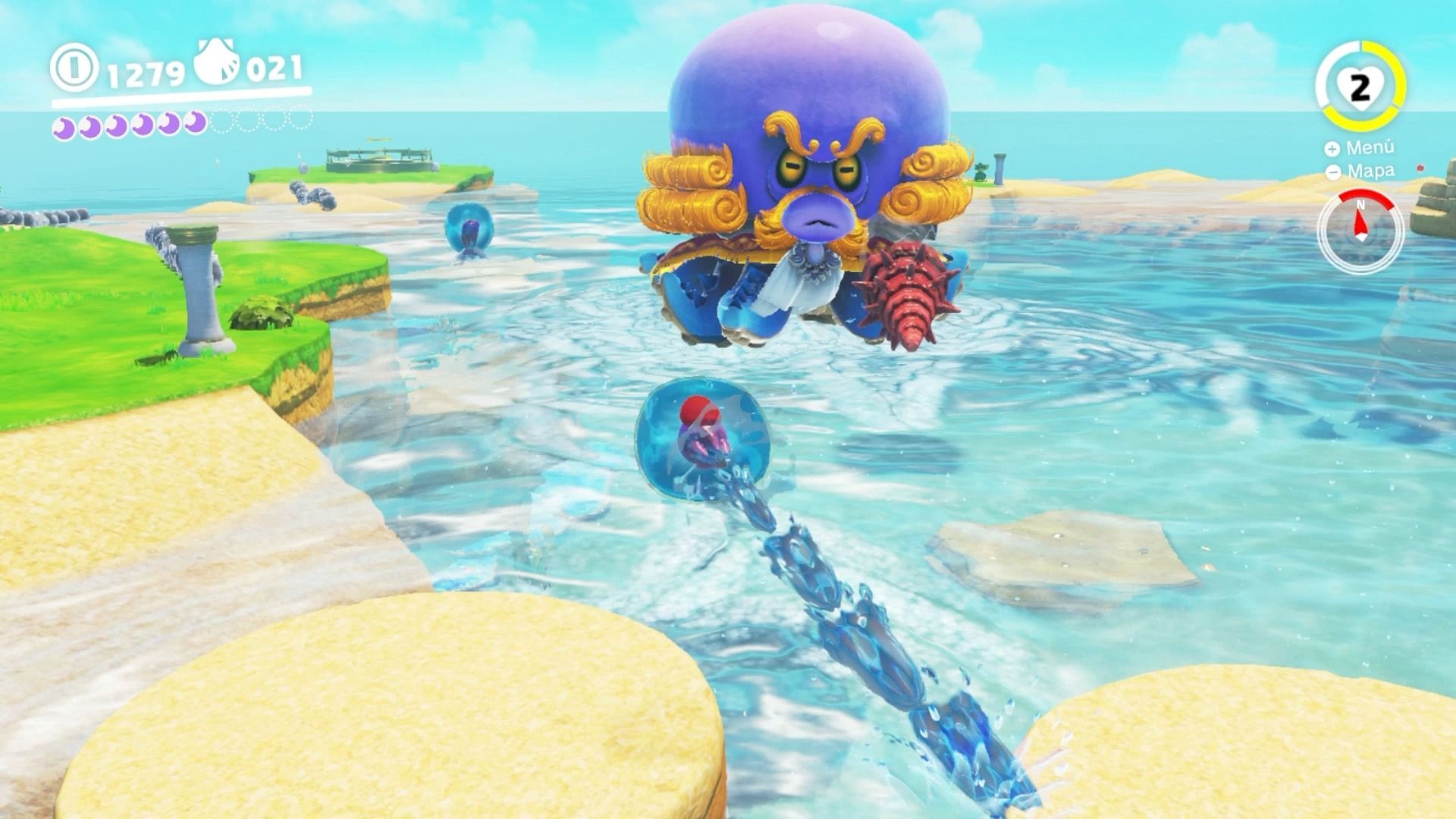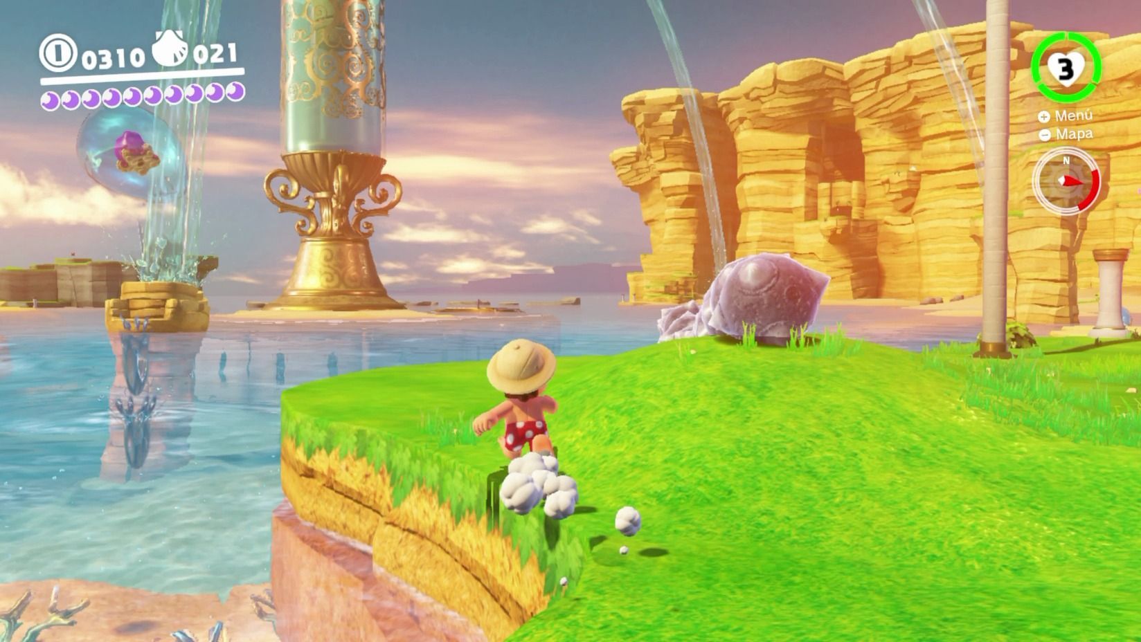 El objetivo en cada reino es encontrar el mayor número de lunas posible, que podemos obtener de muy diversas maneras. A veces simplemente están escondidas en algún lugar de los amplios escenarios, otras hay que obtenerlas superando algún desafío o minijuego, y en muchas ocasiones son puzles relacionados con el entorno, en los que tenemos que realizar alguna acción concreta para obtener una luna. Ya sea por puro instinto, como nos pasó en muchas ocasiones, o por pistas que nos dan los habitantes de los reinos si hablamos con ellos, te vas topando con estas lunas, escondidas donde menos te lo esperas. Algo así como los kolog de Breath of the Wild, pero mucho más elaborado.