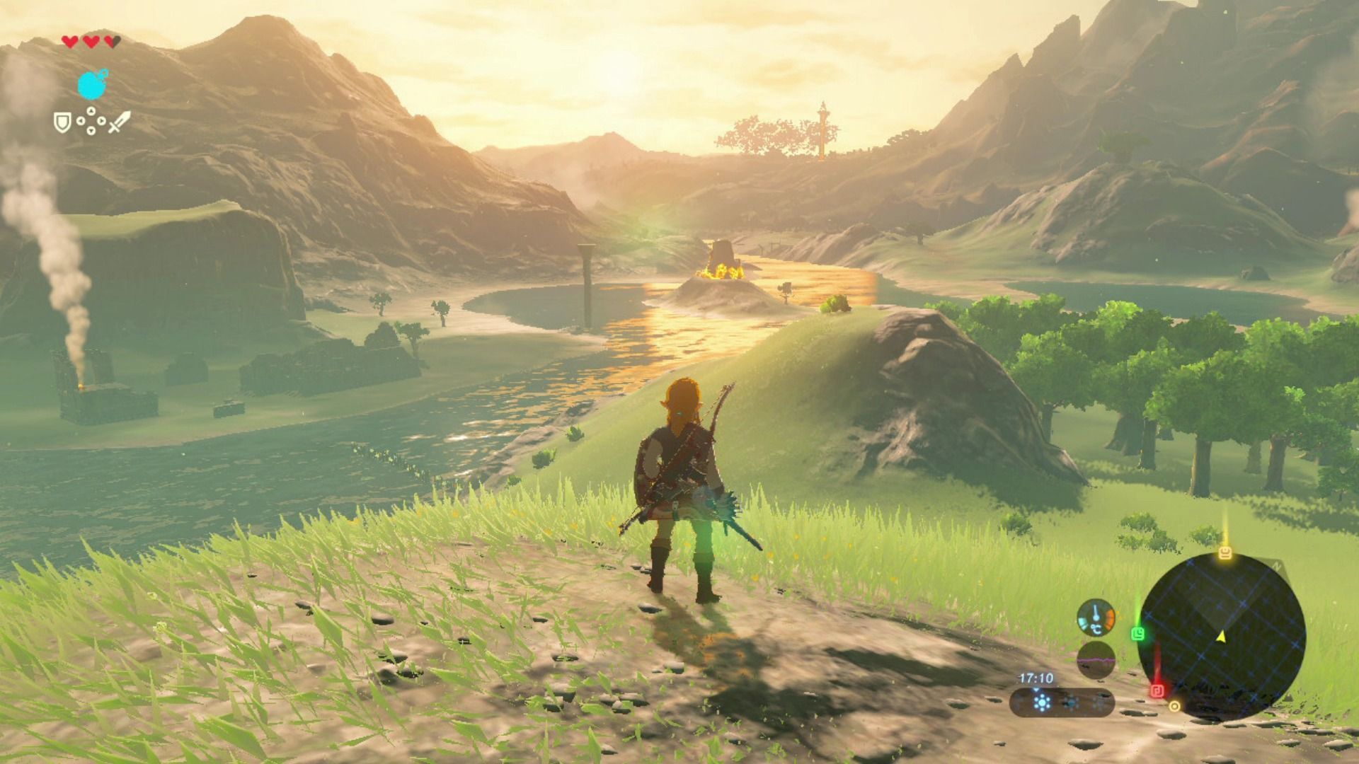 Después de probarlo en profundidad y ver una mayor cantidad de localizaciones o lugares como las aldeas, nos hemos dado cuenta de que no éramos conscientes de lo bonito que es Breath of the Wild, espectacularmente bello en ocasiones. Con unas puestas de sol que obligan a pararte para admirarlas, con unos animales salvajes tan bonitos que te da pena cazarlos con el arco (literalmente), y para que os hagáis una idea más aproximada de cómo se ve, a veces parece una película interactiva del mítico Studio Ghibli.