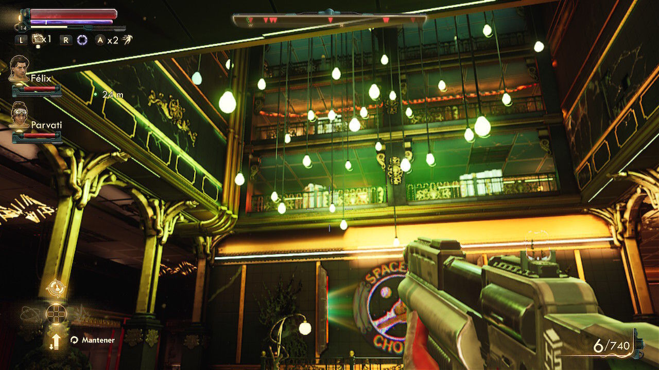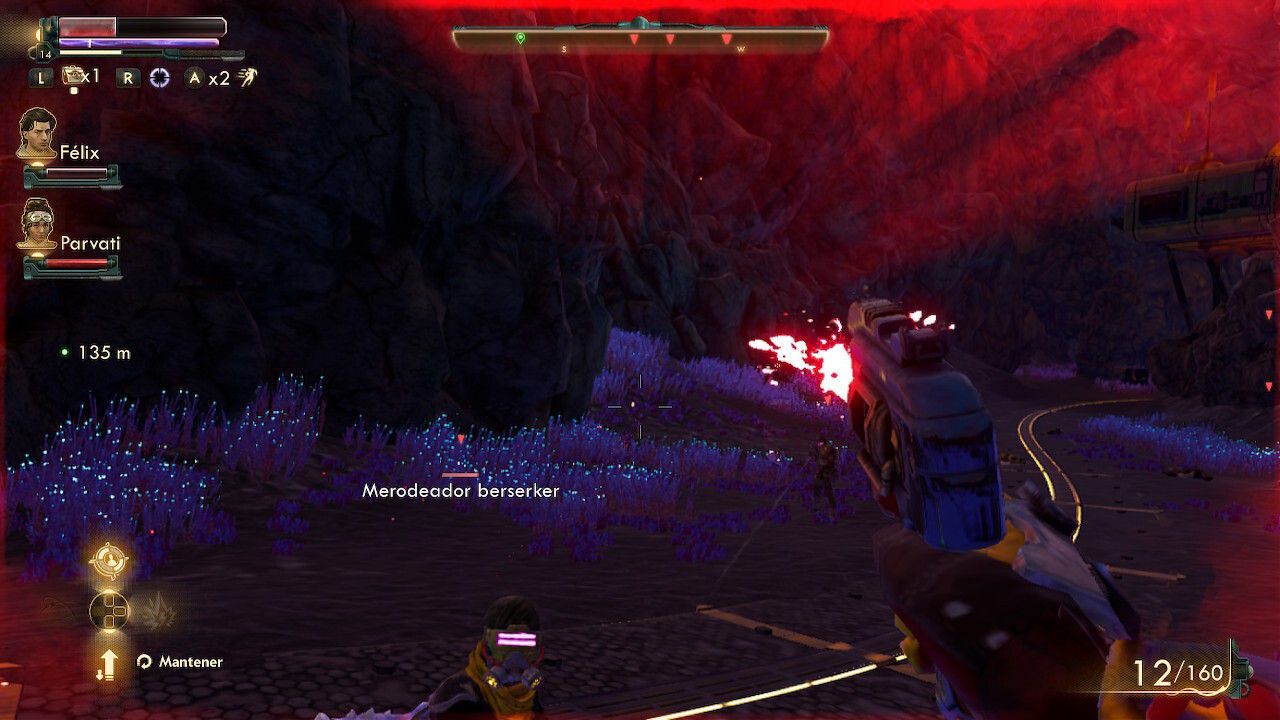 Sin embargo, en Gorgona hemos visto menos problemas de este tipo. La frustrante pausa para cargar el entorno que nos encontramos en los otros mundos no la hemos visto aquí (aunque como esto es algo arbitrario, simplemente puede ser que hayamos tenido suerte), la carga repentina de texturas al entrar a un edificio nos ha pasado con menos frecuencia y la fluidez, excepto en los combates, parece mantenerse algo más estable, aunque sin dejar de ser errática.