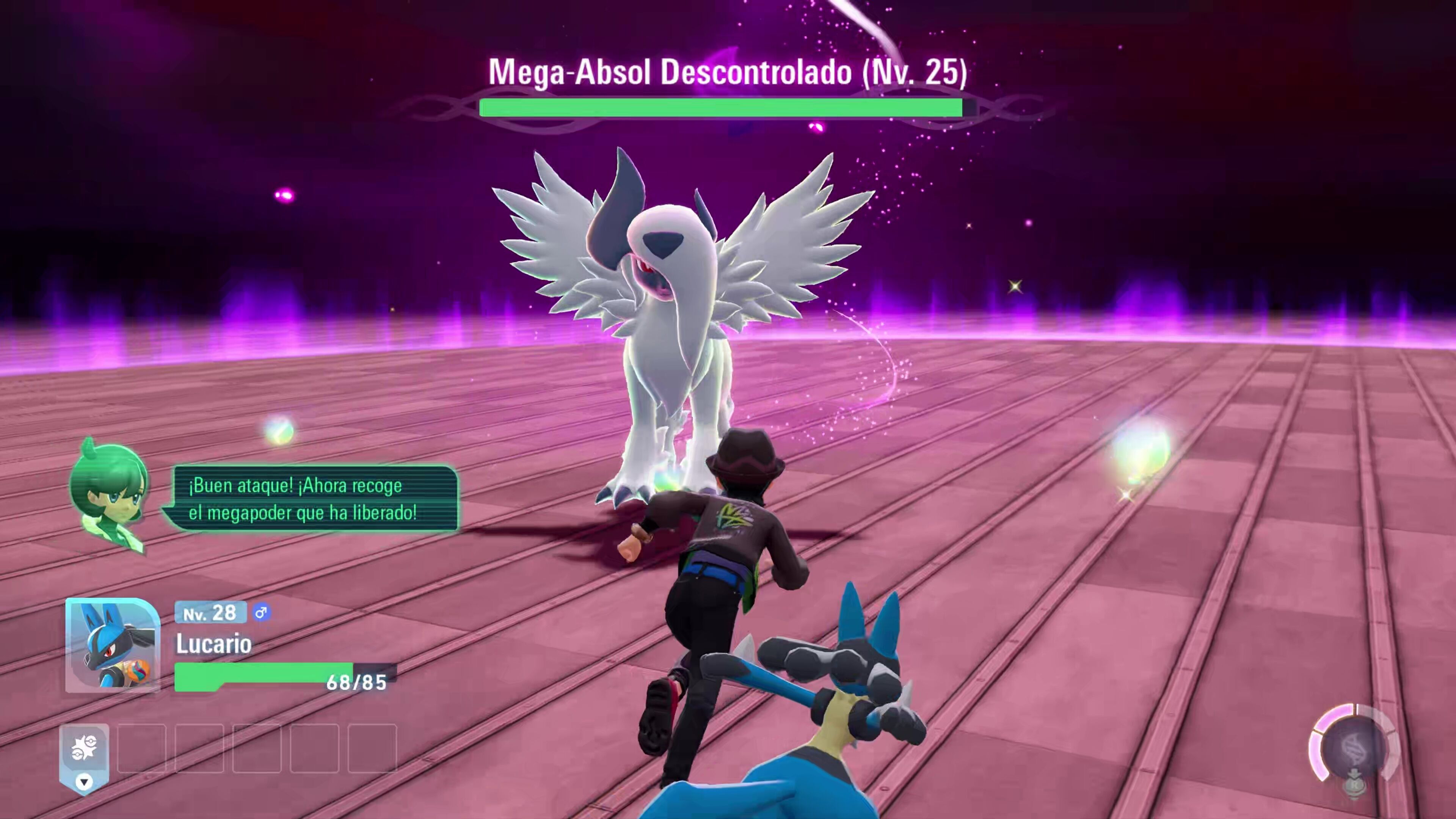Estas batallas tienen el aroma de un combate contra jefe habitual de un juego de acción. La criatura oponente, en este caso un Mega-Absol, ataca tanto a nuestro Pokémon como a nosotros con movimientos cuerpo a cuerpo, a distancia y en área, por lo que debemos esquivar constantemente. A la vez, ordenamos a nuestro Pokémon que ataque, pero esos movimientos apenas le hacen daño. Lo que sí consiguen sus golpes es que del adversario se desprendan orbes que debemos recoger moviéndonos por la arena de combate. Una vez conseguimos los suficientes, podemos Megaevolucionar temporalmente a nuestro Pokémon (un Lucario prestado en esta ocasión) para que sus ataques sean dañinos.