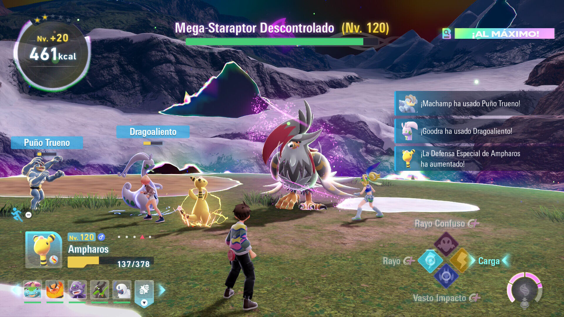 Pero el mayor reto está en los combates en arenas contra las Megaevoluciones descontroladas que marcan los capítulos de la historia principal, ya que parten de la intensidad y dificultad que tienen este tipo de enfrentamientos en los últimos compases del juego base. Son batallas que hemos tenido que repetir en más de una ocasión y que exigen tanto elegir bien a nuestro equipo como ser hábiles a la hora de esquivar los ataques del Pokémon gigantesco. La recompensa vale la pena: nuevas Megaevoluciones, algunas más originales que otras, varias épicas y unas pocas realmente graciosas.