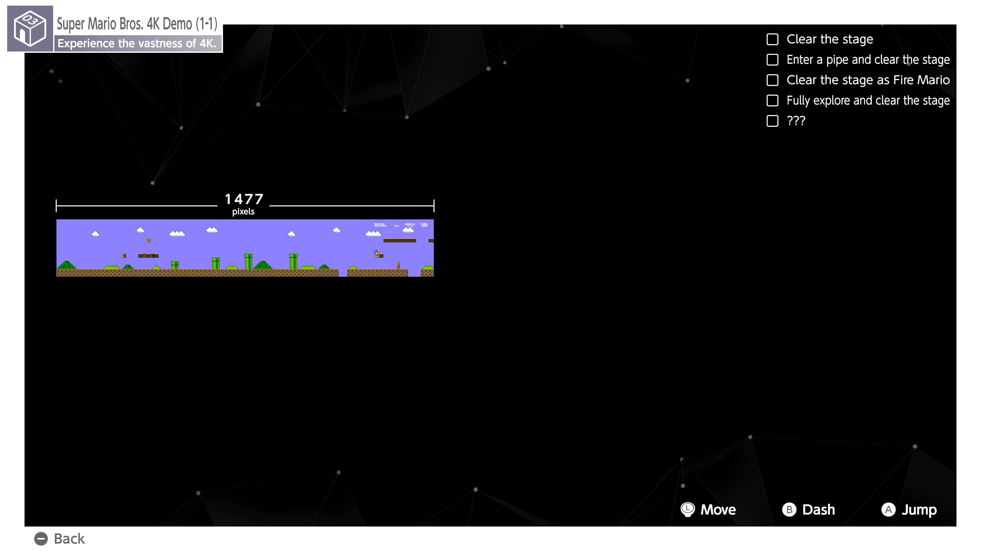 Esto fue todo lo que nos dio tiempo a probar en esta demo, que tenía limitación de tiempo. No obstante, hay bastantes más minijuegos, incluidos algunos que resultan muy nostálgicos, con guiños a los más veteranos. Por ejemplo, hemos podido saber que hay una demo que contiene el primer nivel de Super Mario Bros. para mostrarnos las bondades de la resolución 4K, otra de las características de Switch 2. En este caso, el nivel se mostraba a la resolución original, ocupando una parte ínfima de la pantalla, desplegándose como un pergamino a medida que avanzabas por el nivel.