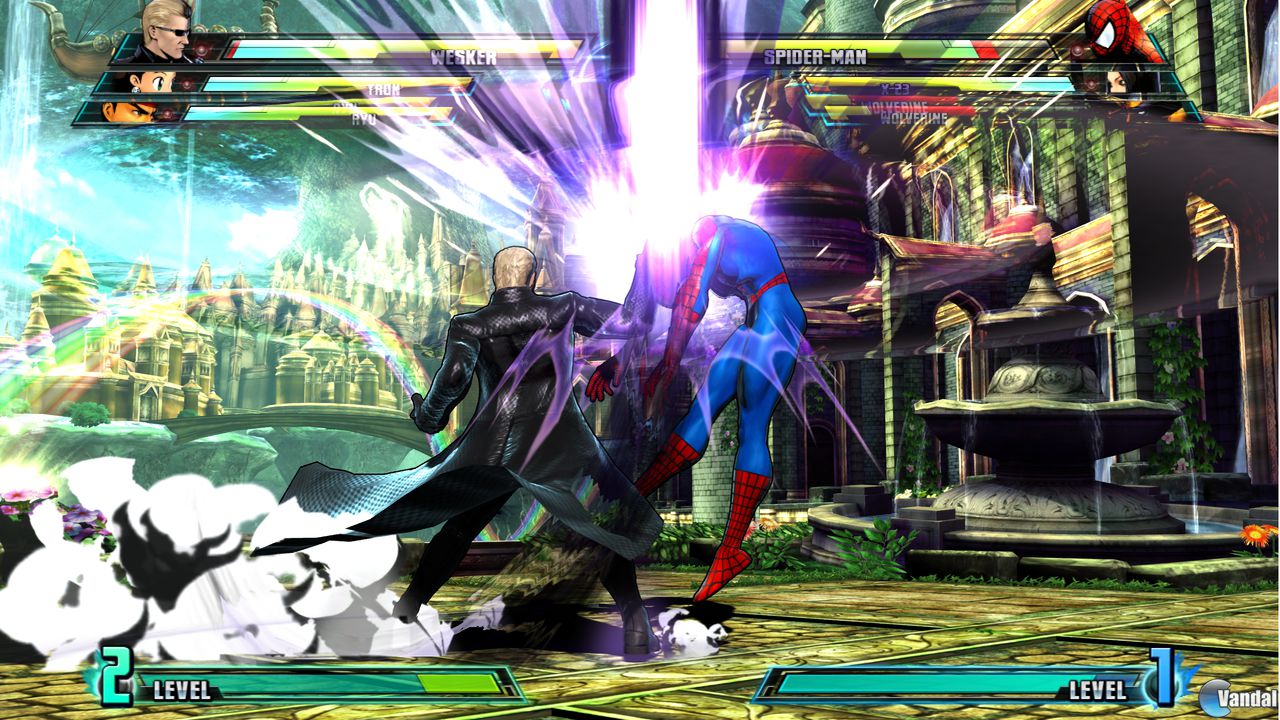 Las batallas se siguen representando de 3 vs 3 y al escoger nuestro personaje podemos especificar su especialidad, por ejemplo con Ryu podemos escoger una especialidad en el Hadooken o bien en un estilo más directo y físico. Una vez comienza la batalla el espectáculo está servido. Simplemente con la secuencia de animación de antes del combate donde puedes ver a Dante, Ryu y Amaterasu en el mismo plano, sientes que la cosa pinta muy bien. Y es que Marvel vs Capcom 3 es una sorpresa muy agradable y con muchas posibilidades. El apartado gráfico es excelente, con los diseños de los personajes en 3D pero siguiendo la estética de arcade de dos dimensiones. Para ello han utilizado el motor gráfico MT Framework, mismo motor de Resident Evil 5 o Lost Planet 2 y que incluso ha sido modificado para sacarle mayor partido. Así pues los miedos de muchos por la inclusión de los personajes en 3D al pensar que modificaría en cierto modo la experiencia del título han quedado desechados ante la superioridad que refleja.