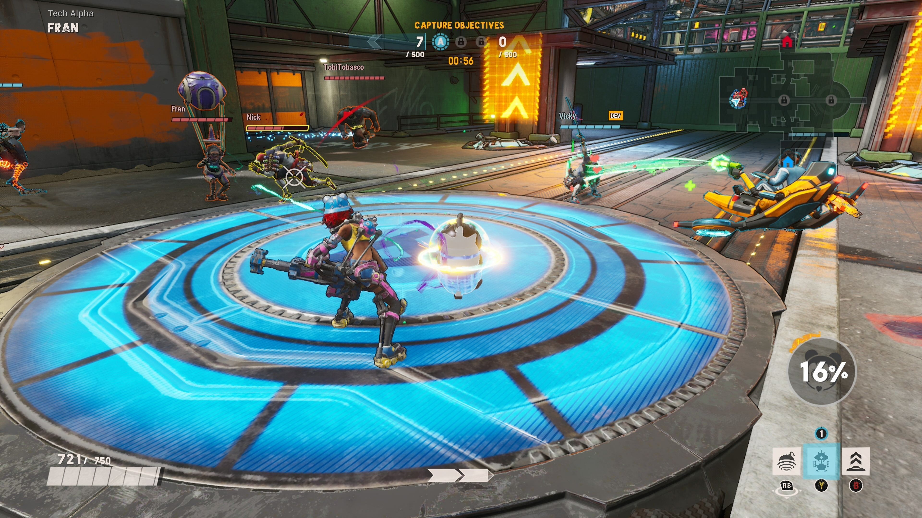 Todas las habilidades se sienten poderosas o, al menos, útiles, pero además cada personaje tiene dos ataques definitivos entre los que elegir y que podemos usar una vez haya pasado el tiempo suficiente para que se llene su indicador. De nuevo, las hay más sencillas y más profundas: Buttercup puede aumentar su daño, robo de vida y salud; Gyzmo puede invocar un mecha con lanzallamas (sí, evidentemente recuerda a D.Va) y Kulev puede crear una copia de un enemigo y controlarla a voluntad con todas sus habilidades. Aunque no lo pudimos probar, los personajes tendrán un sistema de modificadores que nos permitirá hacerles tener más vida, más velocidad, etc., para diferenciarlos del mismo personaje de otros jugadores.