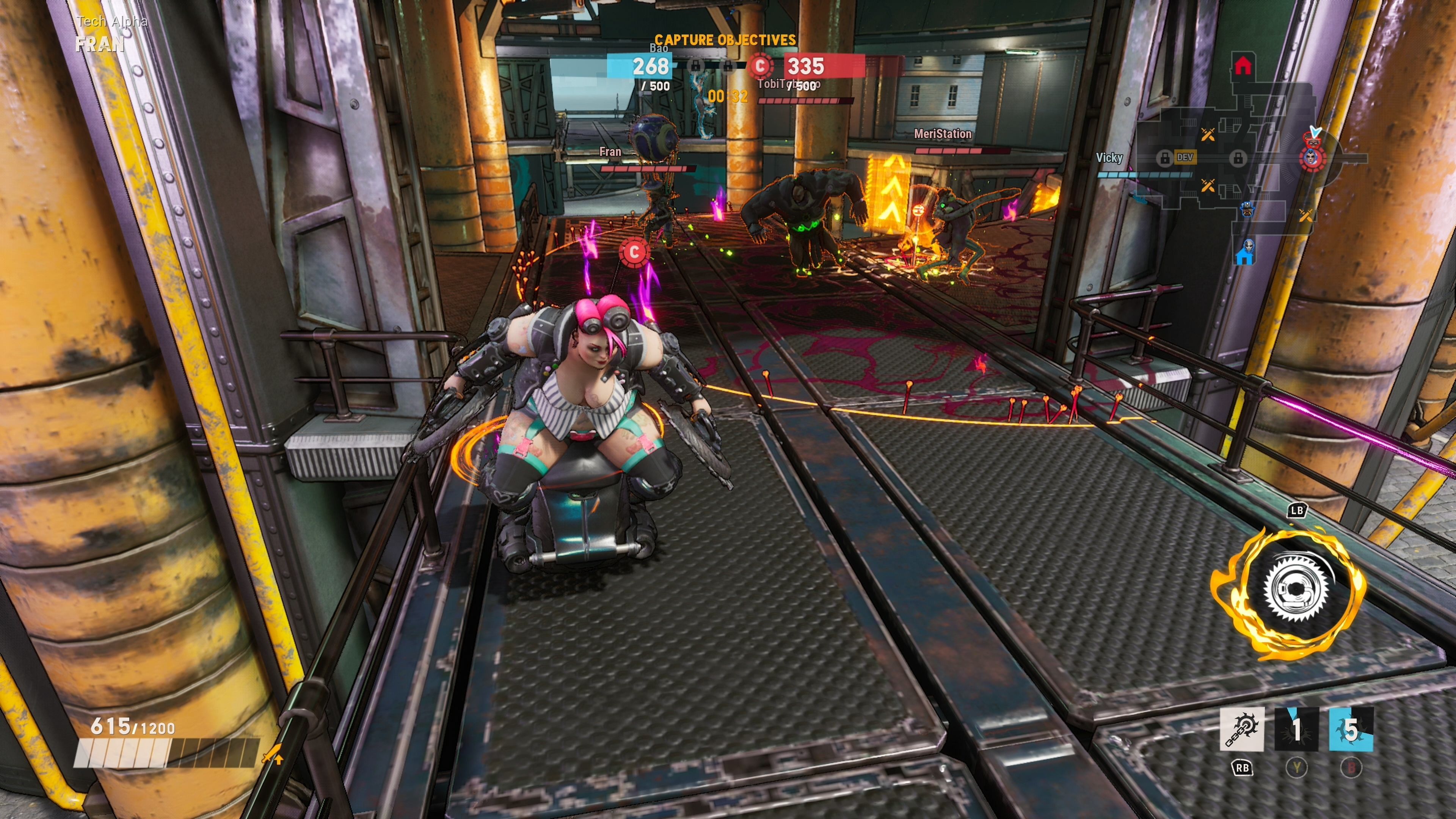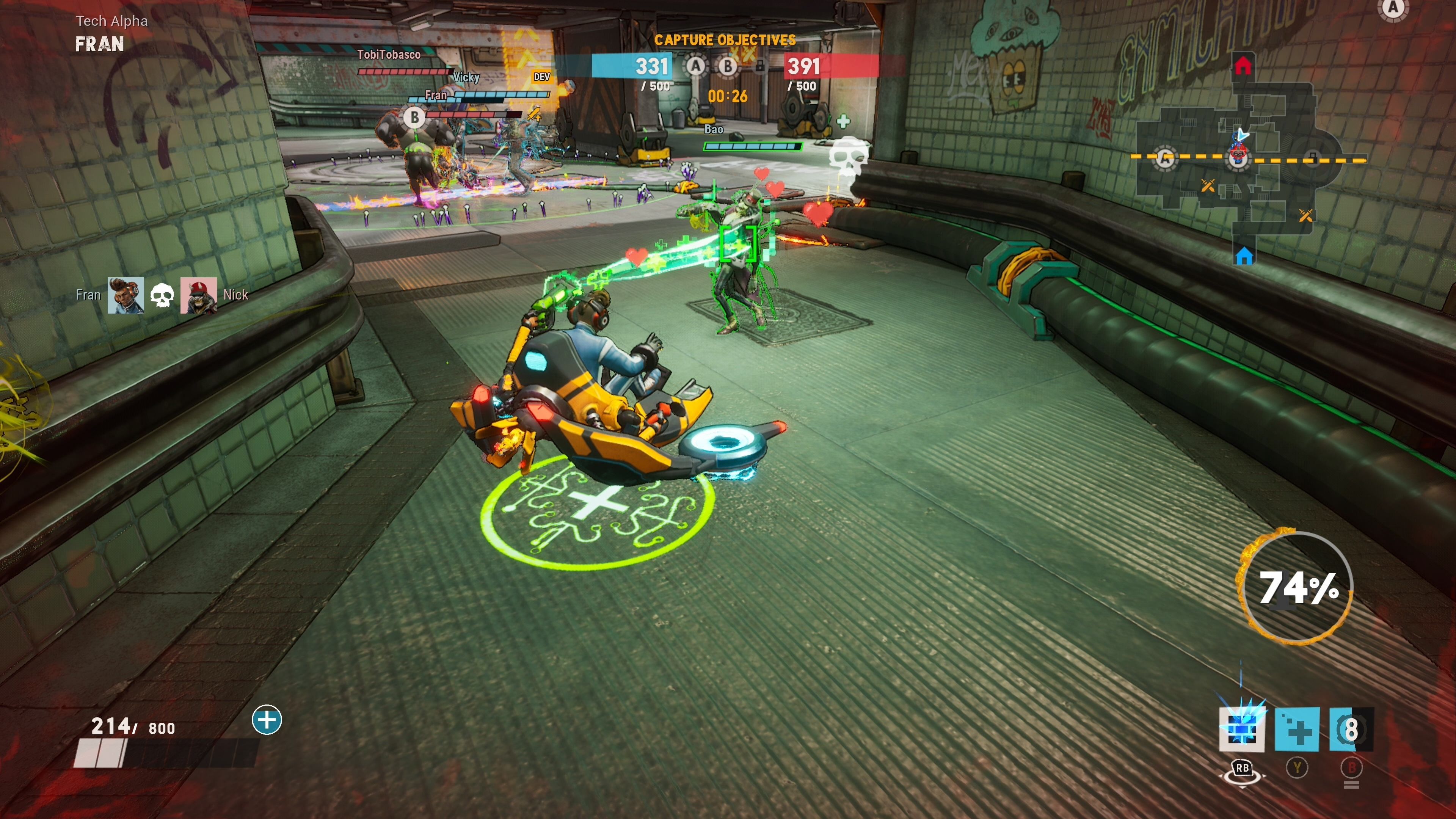 Ese estilo visual representa el tono del juego, también en lo jugable. Sí, como muchos otros títulos del estilo, pasa del fotorrealismo y tira más hacia la animación y el cell-shading para dar vida a sus personajes y entorno; pero por hacer un paralelismo que se entienda rápidamente, si Overwatch es Hora de aventuras, Bleeding Edge es Rick and Morty: aquí tenemos a metaleros que dan golpes con su guitarra eléctrica y disparan fuego con un tubo que le sale de la boca; a una serpiente que se mueve por el escenario usando a un cadáver como si fuera una marioneta; y a una señora que va montada en una especie de moto y que se usa sierras mecánicas girándolas por todos lados como si fueran un yoyó.