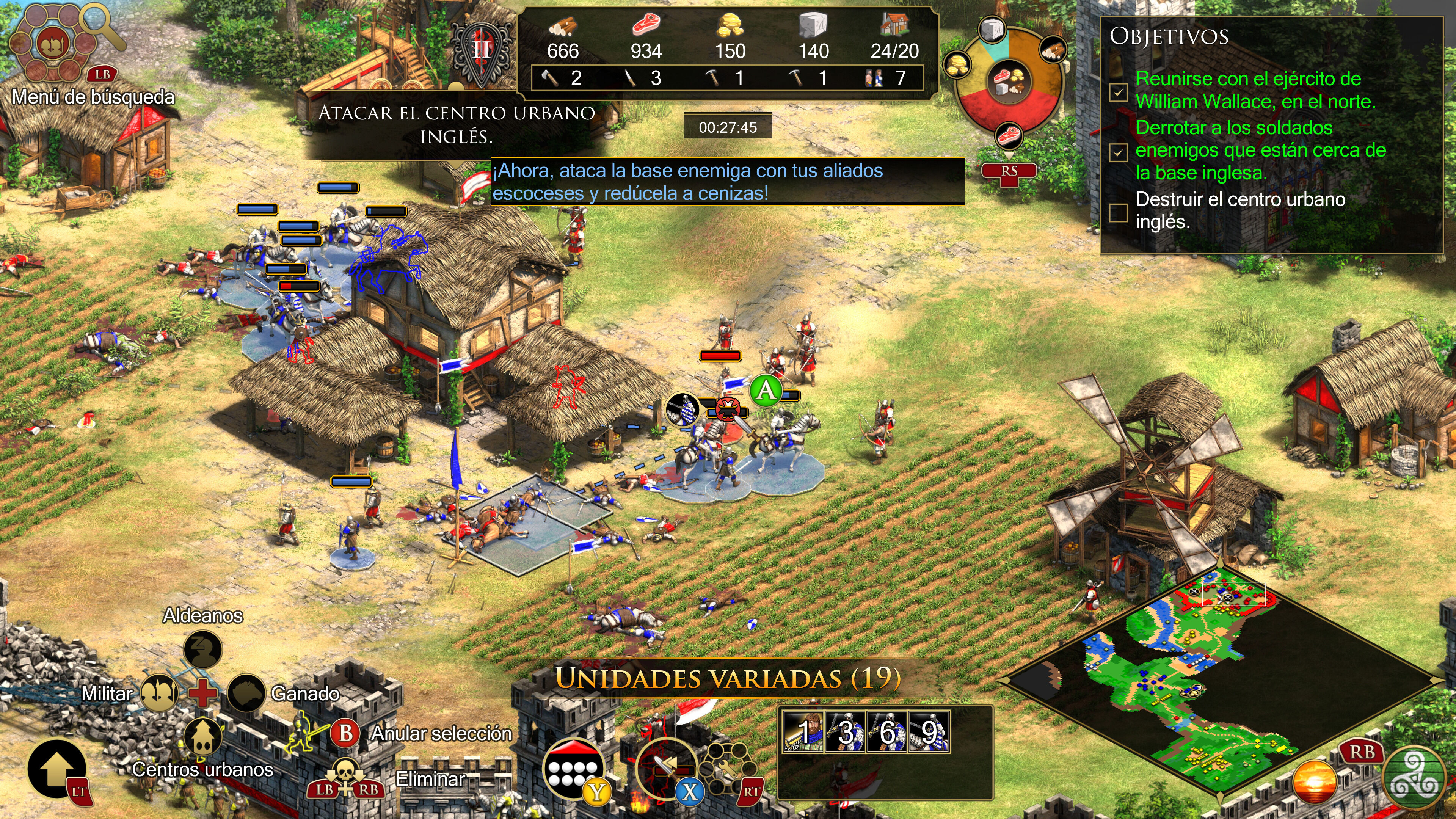 Huelga decir que, independientemente de lo bien que se han adaptado los controles al mando de Xbox y de lo cómodos que resultan, el combo de teclado y ratón sigue siendo la mejor forma de jugar a Age of Empires II, tanto por la velocidad de desplazamiento del cursor como por cantidad de atajos. A fin de cuentas, no es lo mismo pulsar dos teclas para dar una orden que tener que estar navegando por menús radiales, por muy bien que nos los conozcamos, y menos cuando algunas unidades y edificios tienen varias ruedas con sus propias categorías.