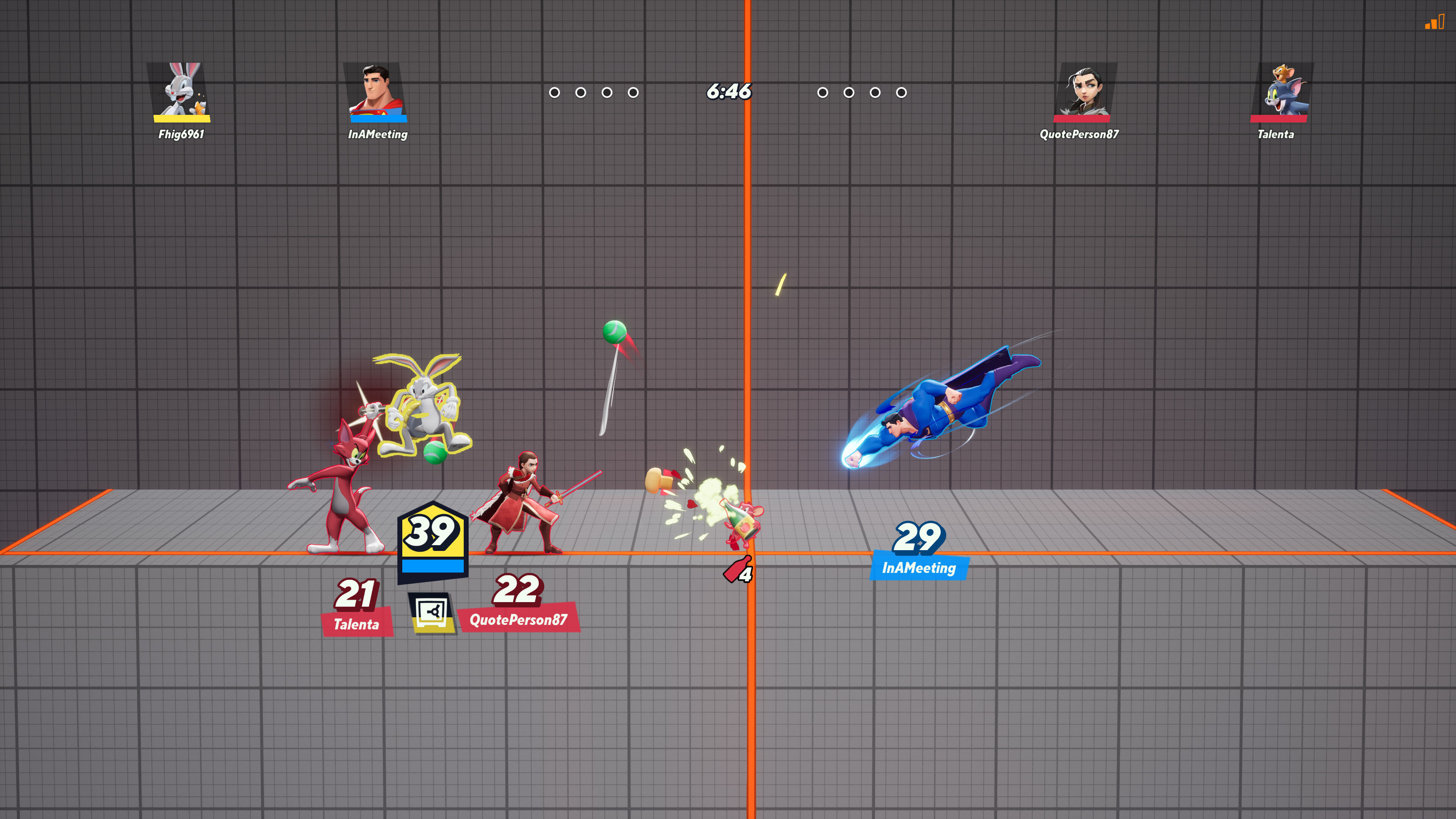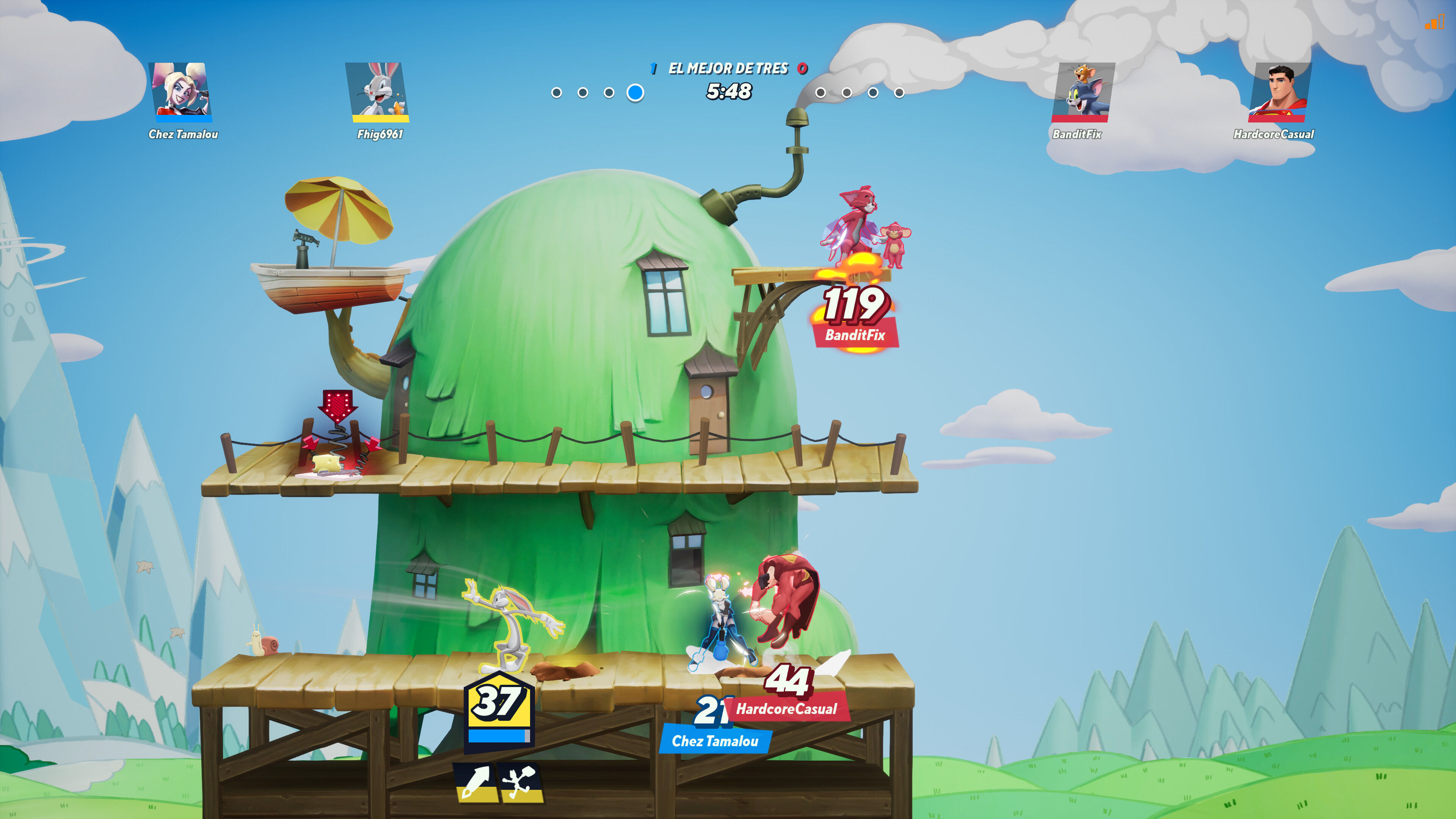 Eso sí, esto no significa que no haga cosas que le den su propia personalidad, tal y como bien demuestra su enfoque hacia los combates por equipos de 2 contra 2, donde encontramos el alma de esta propuesta. El motivo de esto es la cantidad de mecánicas cooperativas con las que cuentan todos los personajes, incentivándonos constantemente a coordinarnos con nuestro compañero para sacarle todo el partido posible a nuestro arsenal de técnicas. Perreno puede atraer a su aliado hacia su posición para rescatarlo de un posible KO, Steven coloca escudos, Taz puede aumentar el impulso y duración de su torbellino si pasa cerca de un amigo y Bugs puede construir túneles bajo tierra para que su equipo los use para desplazarse de un lado a otro rápidamente, unos pocos ejemplos que podemos extender fácilmente al resto del plantel.