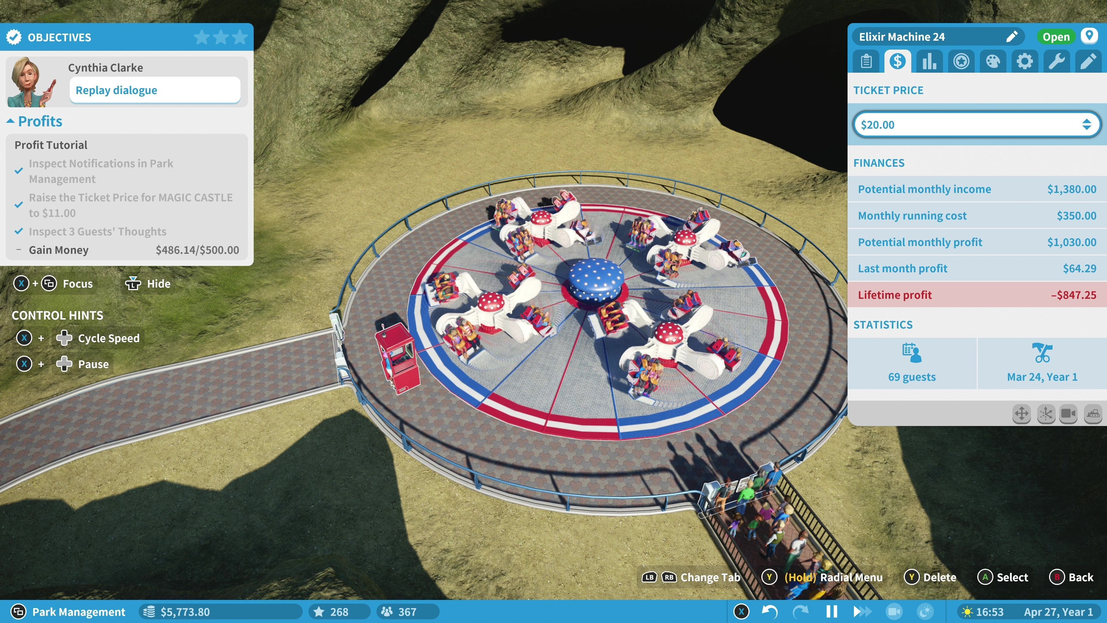 Somos conscientes de que este listado (resumido, de veras) de cosas que podemos y tendremos que hacer en el juego puede resultar agobiante, pero todo se nos explica tan bien que los procesos a seguir y los distintos sistemas del juego quedan interiorizados. En parte porque todo es muy visual. Para ver el estado o el éxito de una atracción tan solo hay que mover el cursor hasta ella y pulsar "A".