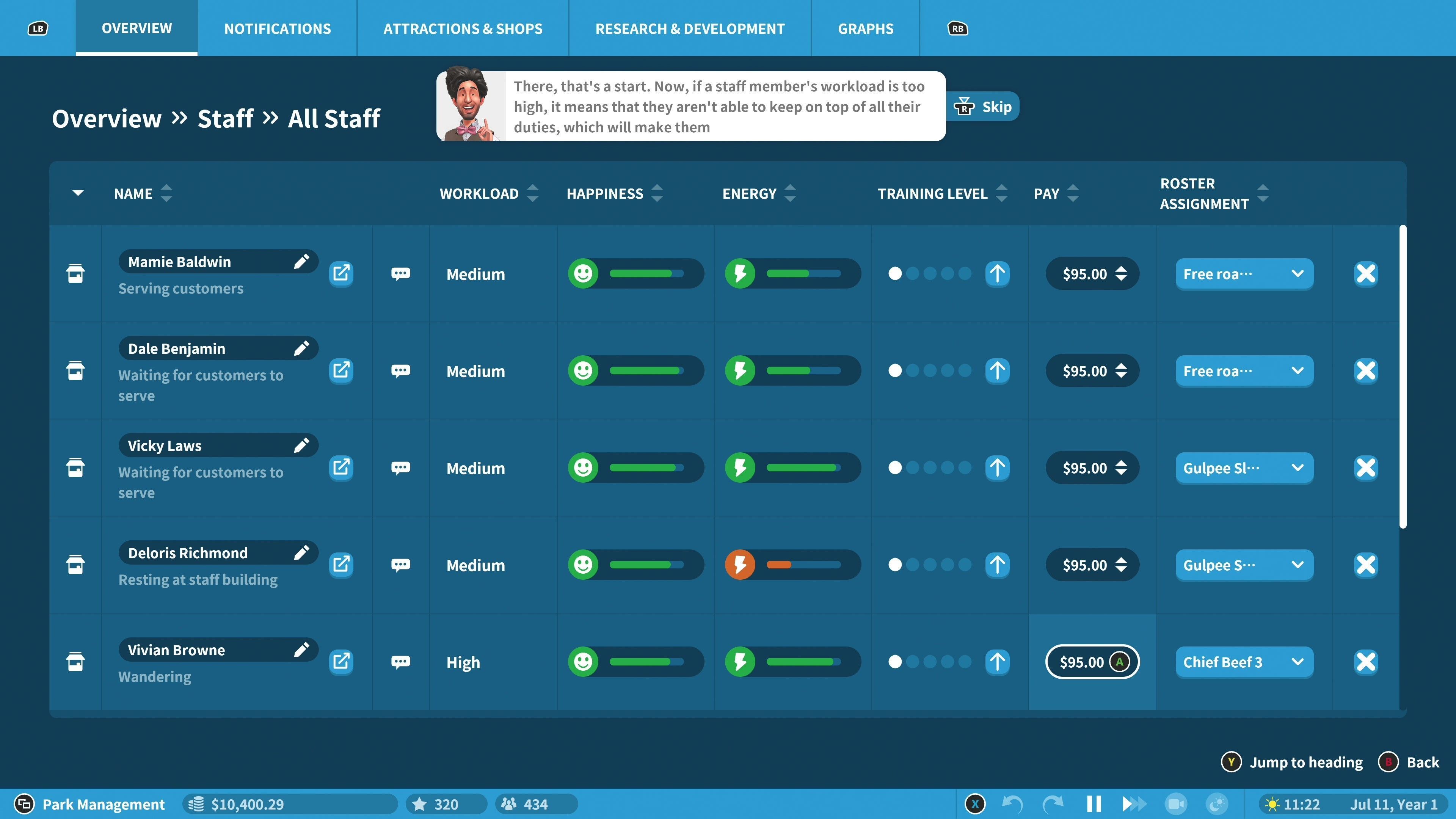 Por lo tanto, estos caracteres nos van guiando por lo básico: poner en marcha una atracción, construir una nueva, decorar sus alrededores para llamar la atención de los visitantes, añadir puestos de bebida en lugares estratégicos para que los invitados gasten más, subir el precio de las atracciones (sin pasarnos) para aumentar su rentabilidad, tener en cuenta la felicidad de los asistentes para planificar las próximas inversiones, contratar personal de limpieza y de reparaciones, administrar el sueldo de nuestros trabajadores, y por supuesto, construir, probar y poner en marcha montañas rusas, ya sea a través de los planos preconcebidos o diseñándolas a mano.