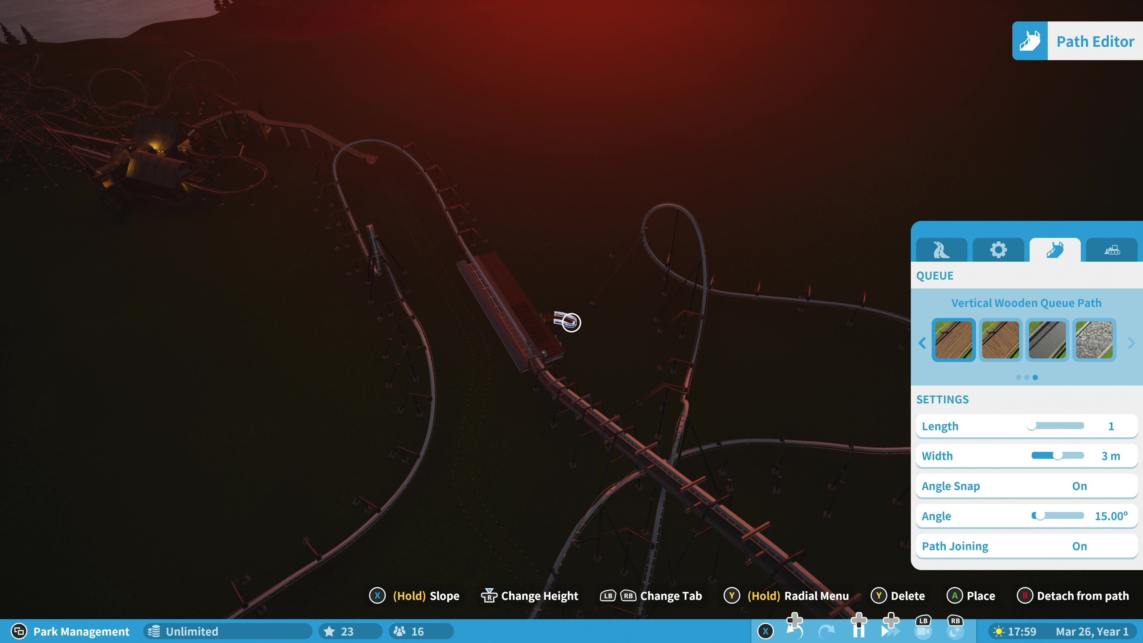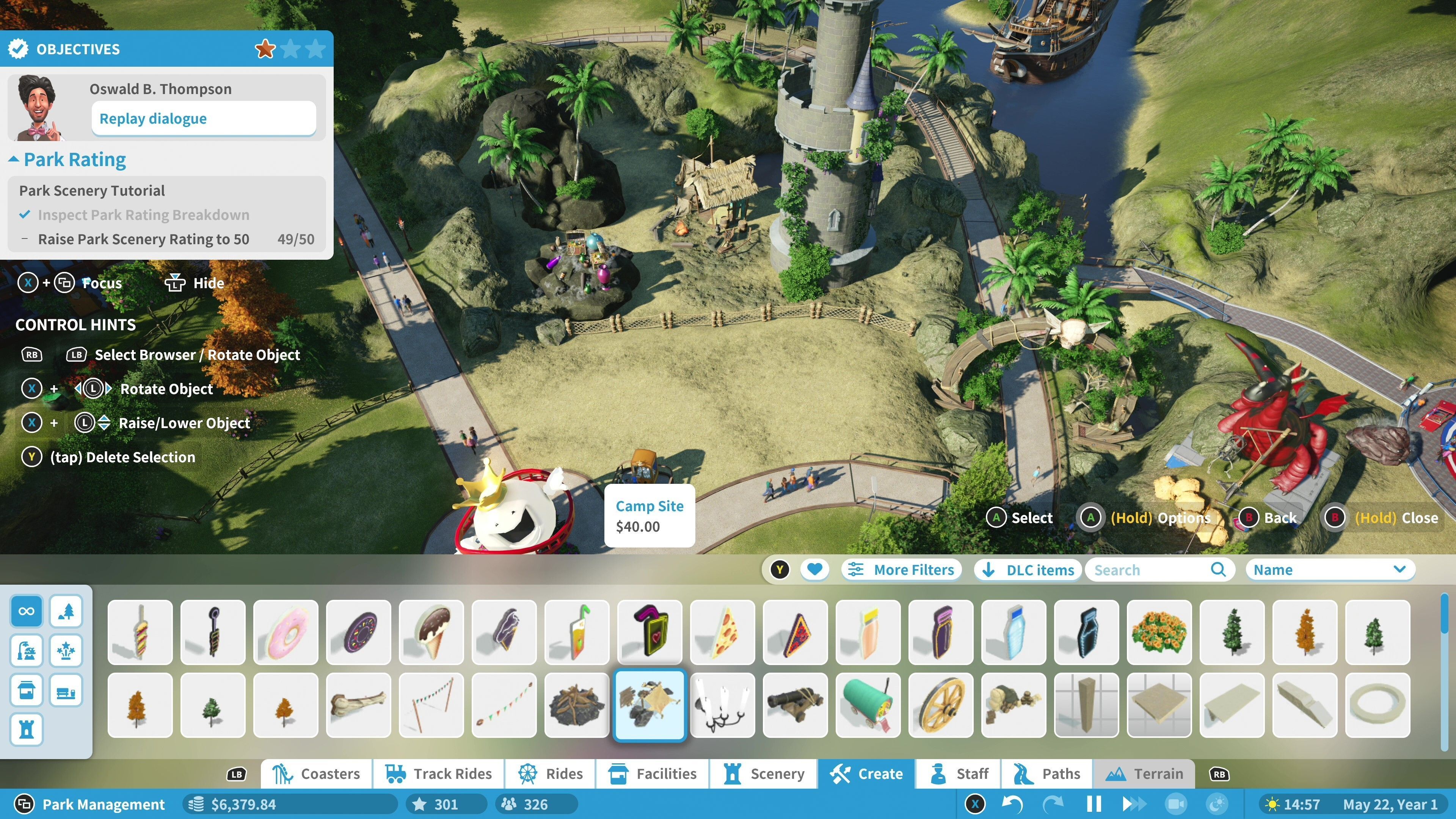 Por otro lado está una reconstrucción bastante a fondo de la interfaz con resultados mixtos: los menús a pantalla completa, como el de ver el estado general del parque de atracciones o el de gestionar el sueldo de los empleados, cuentan con iconos grandes y una tipografía pensada para los televisores; sin embargo, en la pantalla principal de juego tiene que haber tantos elementos que es posible que quienes jueguen a cinco metros de una TV de 32 pulgadas tenga problemas para leer parte del texto (aquí hay textos en español y voces en inglés) e incluso para discernir entre los distintos objetos de decoración.