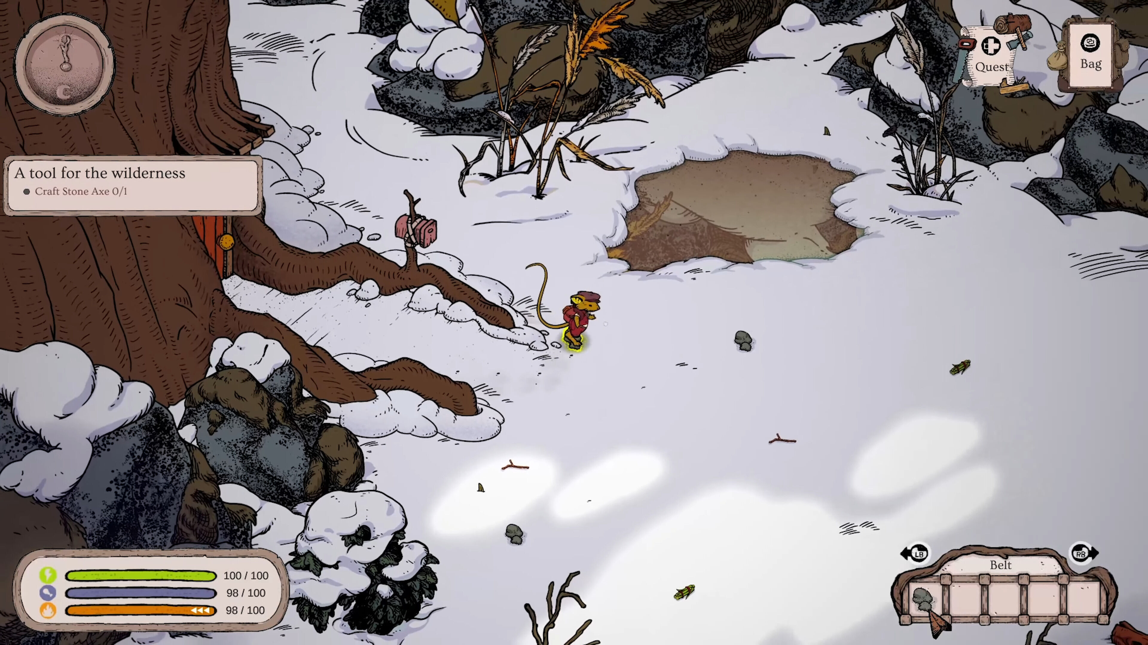 La demostración jugable consistía en hacernos ver las particularidades jugables del título. Salíamos de la madriguera para buscar materiales con que fabricar nuevas herramientas, pero también equipamiento para soportar el entorno gélido en que nos encontramos. El objetivo es ir progresando en las tareas que se te vayan encomendando, siempre evitando que tus niveles de hambre, salud y frío no caigan por completo. Esto hace que no puedas estar explorando indefinidamente, y que también tengas cuidado con las criaturas salvajes que deambulan por ahí.