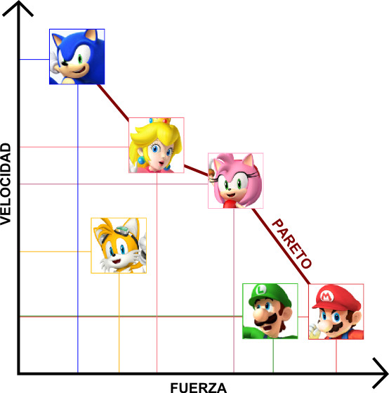 Se dice que una estrategia es dominante o está dominada cuando es mejor o peor en todos los sentidos a otra. Por ejemplo, si un personaje tiene dos ataques cuya única diferencia es que uno causa 1 punto de daño y el otro 2, no hay absolutamente ningún motivo para usar el primer nunca ataque, porque el segundo es objetivamente mejor. Por lo tanto, el primero estaría dominado por el segundo, y la complejidad se reduciría de dos posibles movimientos a uno solo. Siguiendo ese razonamiento, se puede establecer el conjunto de opciones que no están dominadas por ninguna otra, que forman la frontera de Pareto. En el ejemplo de la imagen, suponemos un juego de lucha en el que los únicos parámetros importantes de un personaje son la fuerza y la velocidad. El juego cuenta con 6 personajes, pero solo 4 están en la frontera de Pareto. Luigi es solo una versión más débil de Mario y Tails está dominado en los dos parámetros tanto por Peach como por Amy. No hay ningún motivo para elegir a uno de estos dos. Paradógicamente, a causa del riesgo del desequilibrio, añadir más opciones puede en realidad reducirlas para el jugador. Si en el juego del ejemplo añadimos un séptimo personaje que es tan rápido como Sonic y tan fuerte como Mario, pasamos de tener 4 opciones a tener una sola, porque ahora 6 de ellas están dominadas. Uno de los motivos por los que la complejidad emergente es preferible a la inherente es que cuanta más complejidad inherente, más difícil es equilibrar el juego. Lo que hacen algunos juegos para solucionar este problema es añadir tal cantidad de contenido (complejidad inherente) que sea imposible encontrar las opciones óptimas. Juegos como Pokémon o Magic: The Gathering están desequilibrados por naturaleza, pero mientras sigan añadiendo cientos de nuevos personajes en cada edición, no hay forma de establecer una escala total de las opciones según su utilidad. Otra forma de compensar los desbalances es añadir un sistema de costes como en los RTS, en los que puedes crear unidades mejores y peores, pero las mejores cuestan más recursos, así que no necesariamente son la mejor opción o están siquiera a tu alcance en un determinado momento de la partida. Sin embargo, es bastante difícil balancear correctamente la relación poder-coste y unas unidades acaban poniéndose por encima de las otras, aunque es algo que suele corregirse mediante actualizaciones o parches. Algunos juegos gratuitos se financian ofreciendo opciones que están fuera de la frontera de Pareto a cambio de dinero, y por eso se les llama “pay to win”, pero analizando la frontera también se puede monetizar un juego sin desequilibrarlo, como en el caso de Team Fortress 2, que mantiene los objetos en la frontera, de modo que pagando tienes acceso a más opciones, pero que no son inherentemente mejores. Esto te da cierta ventaja al tener más dónde elegir, pero no hace que puedas ganar más jugando peor. Un juego no-transitivo es aquel en el que las estrategias forman bucles de preferencias, de modo que todas son dominantes y dominadas. Por ejemplo, piedra-papel-tijeras. Añadir subjuegos no transitivos es otra forma de evitar parcialmente el colapso estratégico, como en Pokémon, donde los tipos no dejan de ser una versión muy compleja de piedra-papel-tijeras, y aunque los Pokémon se dominen entre ellos siempre queda la garantía de que serán dominados por el tipo al que son débiles. A la hora de analizar el equilibrio es importante hacer la distinción entre juegos que tienen una fase de elección previa y los que no. En el ajedrez, las piezas están desequilibradas, siendo los peones las peores y la reina la mejor. Esto sería un problema si tuvieses que elegir tu equipo antes de empezar, porque la única opción buena sería todo reinas, pero no es así; ambos jugadores tienen un equipo fijo ya formado, así que los equipos están equilibrados el uno respecto al otro, y además todas las piezas están en juego y ocupan una posición en el tablero, así que su diferencia de poder no reduce la complejidad. También hay que tener en cuenta que el desequilibrio puede darse solo a ciertos niveles. Por ejemplo, los juegos de lucha suelen empezar muy desequilibrados, siendo fácil que un ataque rápido repetido continuamente domine por completo la partida al no tener los jugadores la habilidad o el conocimiento necesarios para contrarestar ese abuso; están equilibrados a nivel medio, y empiezan a derrumbarse a niveles más avanzados, donde los jugadores llegan a superar la posible previsión que tuviese el diseñador y vuelven a encontrar movimientos abusables, solo que esta vez no hay un método para contrarestarlo. En general es más importante el equilibrio para niveles avanzados, ya que la expectativa es que los jugadores acaben llegando hasta ahí, pero es importante tener en cuenta también los niveles bajos para evitar una barrera de entrada o que el juego sea terrible durante las primeras horas. Todo se aplica sobre todo a los juegos multijugador, ya que los que son para un jugador suelen usar el desequilibrio para marcar el progreso. Puede que en el nivel 3 te den un arma que es mejor en todo a la que tenías antes, lo que hace que las armas estén desequilibradas, pero eso en la mayoría de los casos no supone un problema, porque lo que el juego quiere es hacerte más poderoso para que puedas superar los nuevos retos, no que la decisión de qué arma equiparte sea interesante. En los RPG es de lo más habitual que en cada nuevo pueblo al que llegas te vendan en la tienda una versión ligeramente mejorada de tu equipo actual. En casos como estos si que es más cuestionable que no haya cierto equilibrio siquiera en los objetos disponibles en un mismo pueblo, ya que reduce al mínimo la relevancia y el interés del sistema de equipo, convirtiéndolo en una mera tarea. En general el RPG es un género que sufre bastante de excesiva complejidad inherente y mínima emergente, con u
