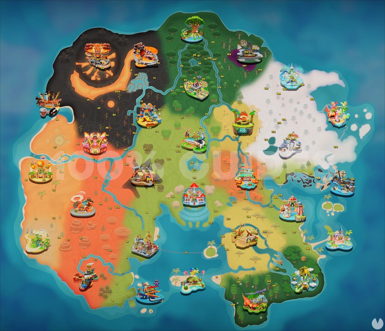 Por otro lado, para mayor comodidad, también te ofrecemos aquí debajo el mapa completo del mundo con las 200 medallas de Peach indicadas en sus posiciones exactas: