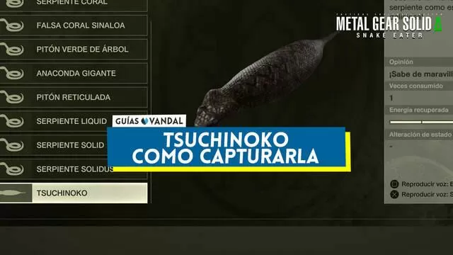 La serpiente Tsuchinoko es el animal más complicado de conseguir en Metal Gear Solid Delta: Snake Eater. Además de que solamente hay una Tsuchinoko por run (salvo una circunstancia muy concreta), el bicho no aparece sin más y encima se escapará en un momento dado de la historia. Para que no tengas problemas en hacerte con ella, en esta sección de la guía te explicaremos cómo atraparla y conservarla.