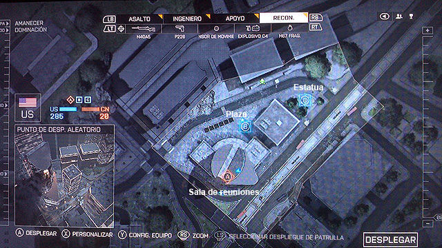 En la plaza al noreste tenemos C, cuidado con los enemigos en la segunda planta del edificio colindante, las dos calles norte y sur, más al norte cruzando la calle tenemos una posición elevada, para poder cubrir ambas calles y el edificio.