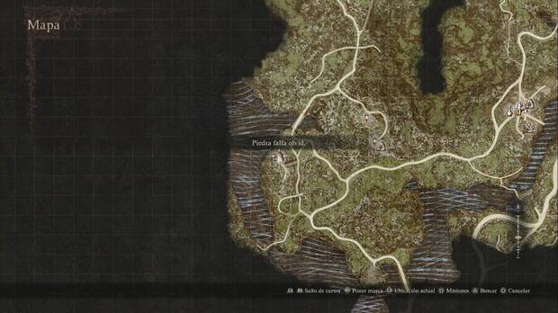 En una esquina hay una puerta, tras ella hay un cofre con un Bastón acorazado, que puedes entregarle a un mago para que lo use como arma. Vuelve al camino y sigue hacia el sur, subiendo una colina. Arriba, junto a una extraña estatua, hay un cofre con una Lasca del despertar. Desde aquí puedes deslizarte colina abajo hacia el sudeste. Fíjate en que puedes empujar la roca antes de hacerlo, si no eliminaste a los goblins antes, ahora caerán. Antes de volver al seguir, fíjate en el mapa bajo estas líneas y localiza la Piedra falla olvid. en lo alto de una colina. Tienes que dar un pequeño rodeo para llegar a ella.