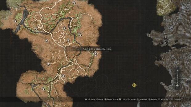 La Cueva de la arena marchita se encuentra en la zona de Battahl, la parte desértica al oeste-suroeste del mapa.