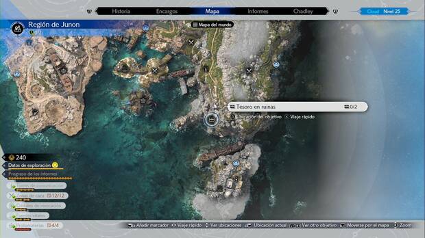 La segunda zona con tesoros se encuentra en la costa nordeste de la isla más al noroeste de la región. Acércate con el chocobo acuático por la costa para localizar el punto de viaje rápido.