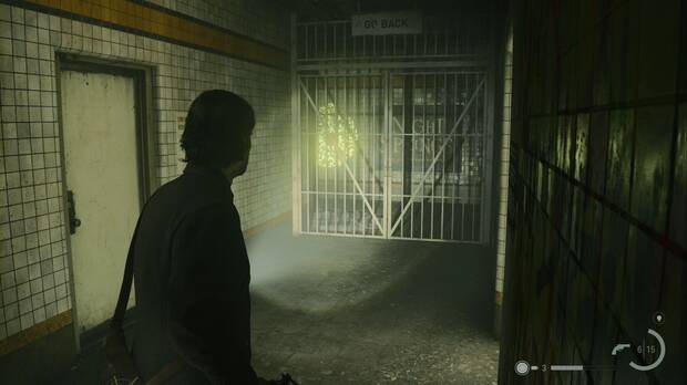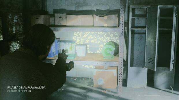 Al hacerlo aparecerán varias sombras. Recuerda que debes apuntar ocn la linterna y lanzar un flash para que los "enemigos" sean vulnerables antes de disparar. Después de acabar con ellos mira hacia la parte superior de la pared al subir a donde estaban. Verás las palabras a la izquierda según subes las escaleras.