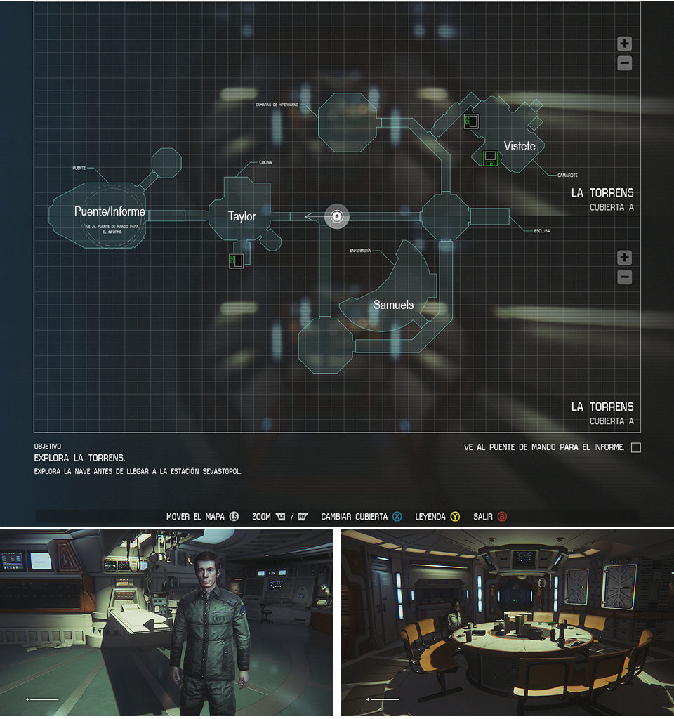 Vemos Terminales de acceso donde desbloqueamos archivos para leer, siempre que veamos uno nos conectamos a ellos A Samuels le encontramos en la enfermería y a Taylor en la Cocina. Cuando hablemos con los dos la Capitana de la Torrens cita a todo el mundo en el puente de mando para el informe, la capitana nos comenta la misión y hay que recoger el informe preliminar sobre la mesa. Al cogerlo salta una secuencia donde se ve la aproximación hacia la estación Sevastopol, la estación parece dañada y se oye un mensaje poco audible donde piden ayuda. La tripulación decide ponerse los trajes para llegar hasta la estación. Tras un accidente, solo Ripley consigue llegar hasta la estación.