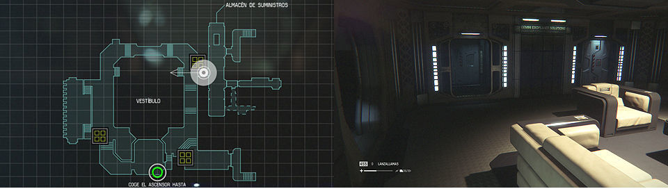 El ascensor hacia los laboratorios Gemini está en el piso superior de la zona donde cogimos el Sintonizador de acceso. La mejor manera de llegar es accediendo por cualquiera de las zonas donde cerramos las escaleras y el acceso a Suministros y Mantenimiento. Por arriba salimos al piso superior y por abajo al inferior, en la zona hay humanos muy cerca del ascensor, que está en la cabina con los sillones, aprovechamos al Alien para librarnos de los humanos y coger el ascensor.