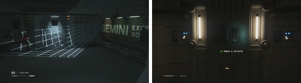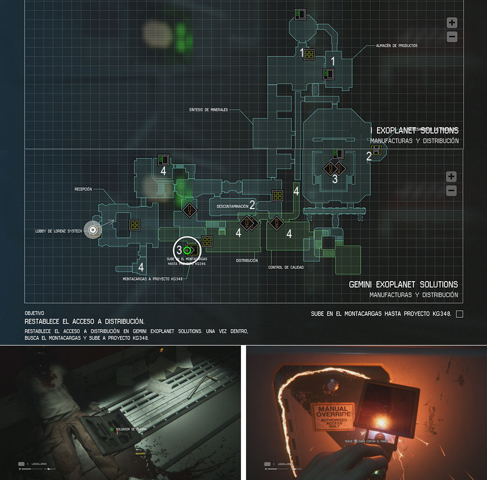 1. Al bajar del ascensor accedemos a Gemini Exoplanet Solutions, lo primero que tenemos que hacer es reestablecer el acceso a Distribución. En la primera puerta por la que pasamos encontramos una superviviente sentada, como ida, no le hagamos nada o termina la partida. Avanzamos por las instalaciones hasta el punto de destino (todo está cerrado), en la zona de destino hay una cámara de vigilancia que si nos detecta atraerá la alarma al Alien al instante (cuidado con su barrido que es muy amplio).