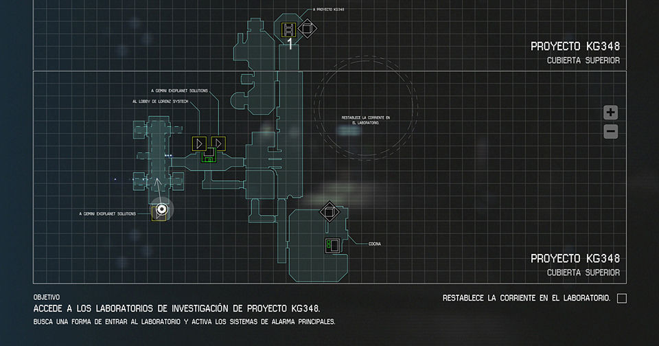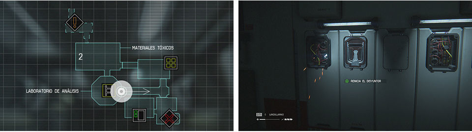 1. Accedemos al Laboratorio de sustancias Nocivas, todas las puertas están cerradas hasta que restablezcamos la corriente. Por los conductos del suelo podemos recoger ítems. Hay que rodear todo hasta llegar al Laboratorio de Síntesis donde tenemos un punto de guardado y el mecanismo para reactivar el Disyuntor y reactivar la energía.