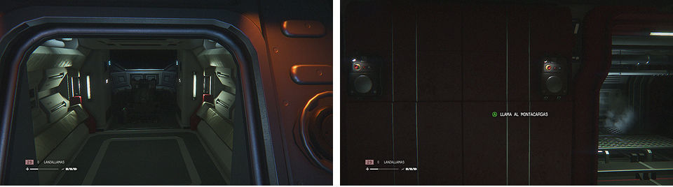 Si usamos el cierre antes no podremos pasar, lo cogemos todo y usamos el mecanismo, esto cerrará un acceso a la escalera y el acceso a mantenimiento -En el segundo piso tenemos otro cierre, en el cadáver del suelo recarga de Lanzallamas y en el pequeño pasillo a la derecha recarga para la porra eléctrica-. Lo cogemos todo y activamos el mecanismo, lo que cierra el segundo acceso a la escalera y el acceso al almacén de suministros.