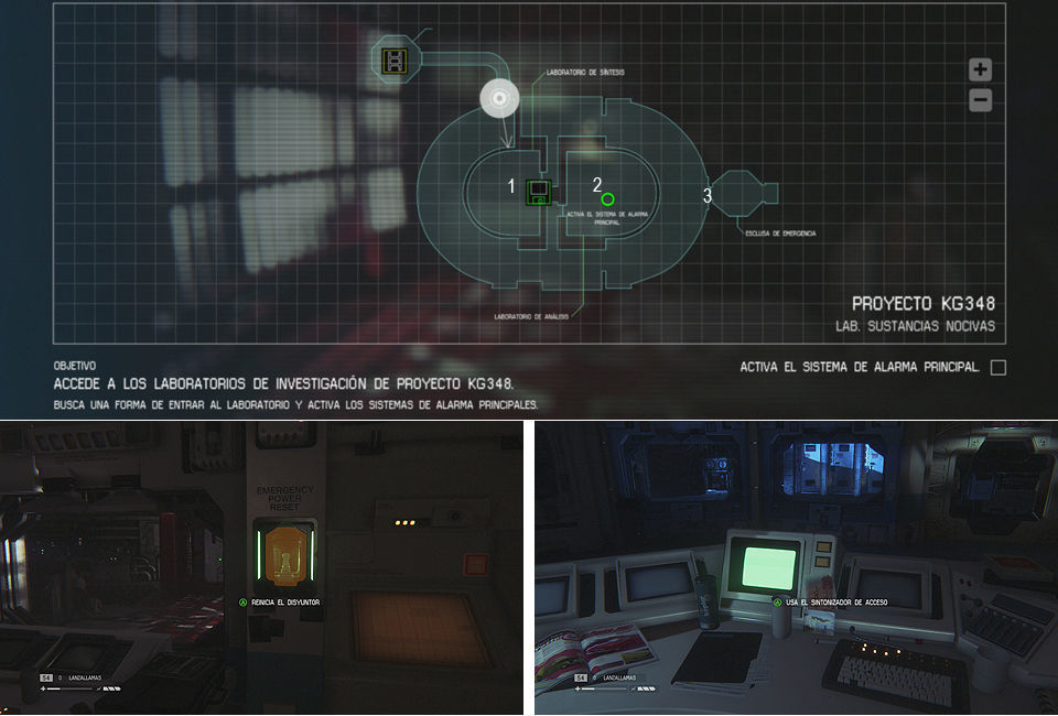 1. Llegamos a la zona del Proyecto KG348, por los conductos del suelo en este primer pasillo tenemos items, avanzamos y tenemos un panel para usar el Sintonizador y reestablecer los ascensores, avanzando y bajando encontramos a un superviviente en lo que señala como cocina, sobre la mesa de juego un cadáver que tiene una Tarjeta de Acceso que nos sirve para la puerta a la izquierda antes de llegar a las escaleras que bajan al Laboratorio, (dentro hay un archivo de audio). Recogemos todo y bajamos. Cuidado constantemente con el Alien, para acceder a la escalera tenemos que usar el soldador.