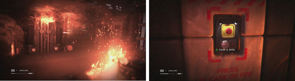 Justo al hacerlo hay una explosión y se genera un incendio, además sale un androide en llamas que tenemos que eliminar, pero nos costará poco ya que casi esta hecho polvo. Dentro hay que encontrar un sistema contra incendios para apagar el fuego y poder recoger los ítems que hay por la sala (no tenemos porque entrar en esta sala).
