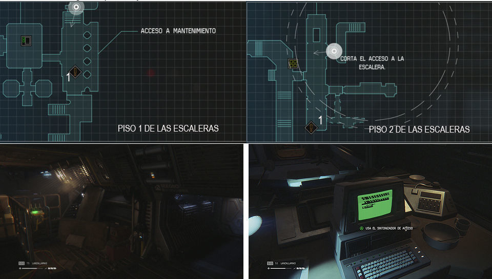 2. Las escaleras tienen 2 pisos, en el primero encontramos el primer mecanismo para cerrar los accesos usando la herramienta de mantenimiento. Pero antes de hacerlo, avanzamos por la puerta que lleva hacia la izquierda en el mapa, donde encontramos un Terminal para usar el sintonizador y desbloquear las celdas en Sistemas (están delante del Terminal donde el cadáver en el suelo). Aquí tenemos otro cadáver y una placa identificativa, por la derecha tenemos una puerta con cierre manual que da al Lobby donde cogimos el Sintonizador.