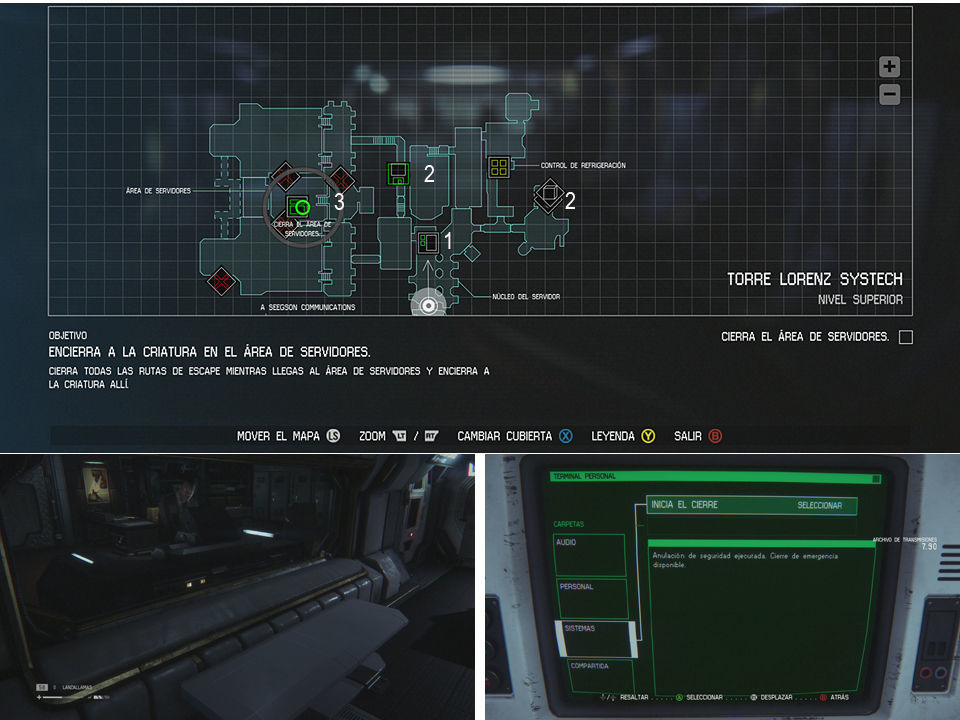 3. Ya solo queda dirigirnos hacia la sala central donde está el cierre del área de servidores. Antes, desde la izquierda y bajando, podemos llegar a la sala donde estaba Ricardo y aquí desbloqueamos dos puertas con abrazaderas. Una lleva al guardado en el pasillo donde hemos recogido el Emisor de Sonido V2 y la otra al Terminal donde activamos la Anulación. En la sala anterior a ésta usamos el Sintonizador de acceso para llegar a la sala de control de servidores. Aquí según entramos a la derecha hay una sala con gas que no podemos pasar hasta obtener la máscara de gas rn un capítulo posterior. Bajamos, recogemos la munición del lanzallamas junto al terminal y cerramos el área. Hay un fallo en el plan y no podemos escapar, el Alien merodea en la zona constantemente, lo mejor es escondernos hasta que Ricardo reactive el sistema y podamos salir.