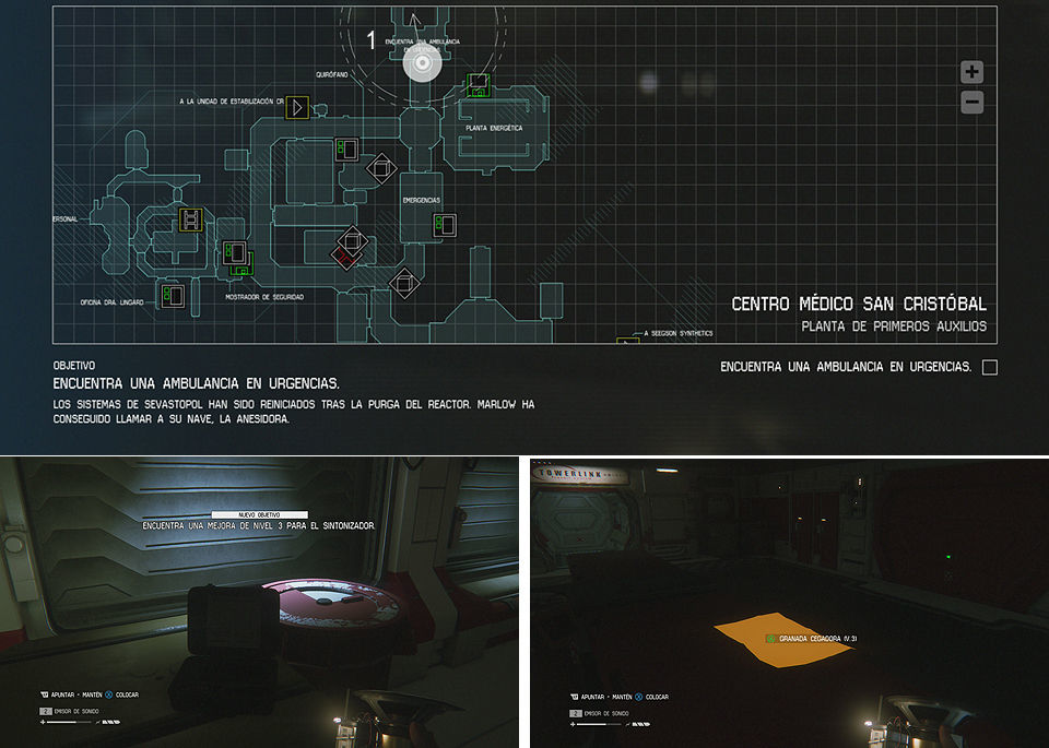 Dentro de la plataforma de Ambulancias encontramos dos nuevas mejoras, una para la "Granada Cegadora V.3" y una mejora de nivel 3 para el Sintonizador. Con esta mejora pocas puertas se nos vana resistir ya, lo usamos sobre la puerta que nos bloquea el camino, activamos el transbordador que encontramos para llegar a la Anesidora.