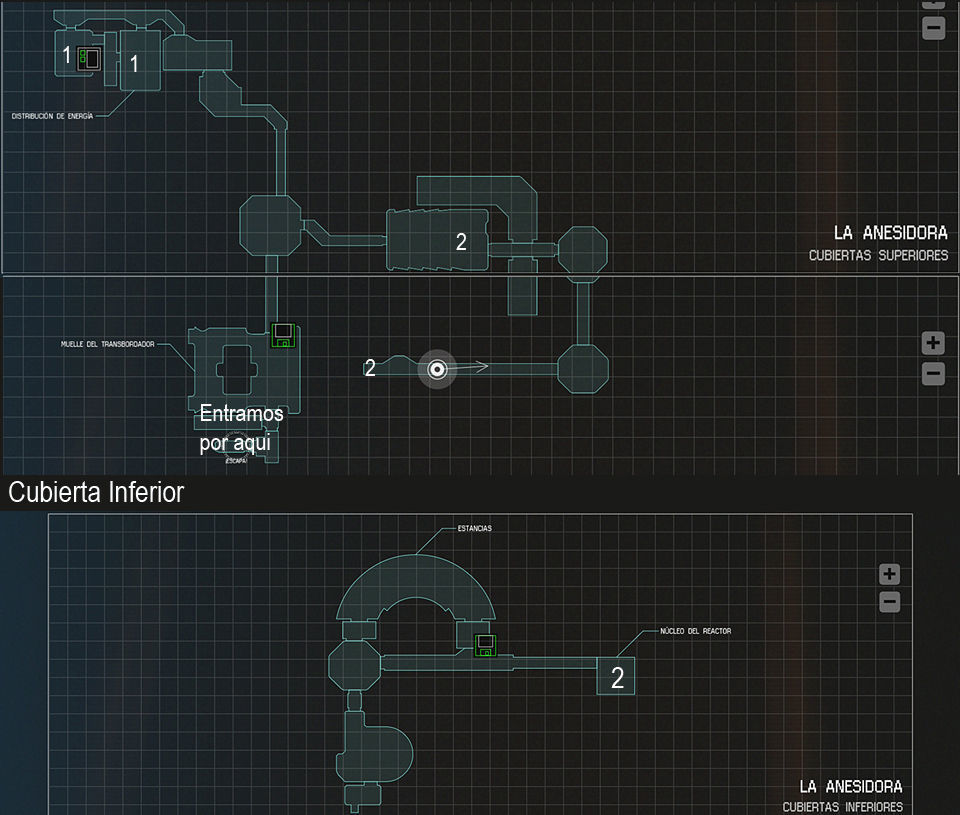 2. La mayoría de puertas se han desbloqueado y oímos la voz de Marlow hablándonos por el sistema de altavoces. Debemos encontrarle en el piso de abajo, su intención es evitar que la compañía se apodere del espécimen. Cuidado por el camino que nos vamos a encontrar con un parásito en la sala marcada con 2, descendemos hasta las cubiertas inferiores