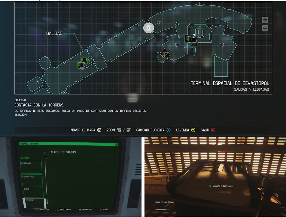 Subimos a la cabina, tenemos un punto de guardado y un mecanismo para activar un generador manualmente. Pulsando el botón cuando nos lo indiquen se enciende el Terminal de acceso en el centro de la cabina. Aparte de los textos donde nos dan el código de la puerta de abajo 0340 en la carpeta "Sistemas" podemos abrir las puertas de la zona de salidas.