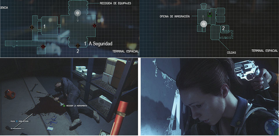 2. En seguridad hay un punto de guardado. Por la puerta salimos a un pasillo donde tenemos otra puerta con abrazadera, una sala vacía y otra puerta. Entramos en una sala con estanterías y un cadáver tras unas rejas, por el fondo a la izquierda tenemos un conducto que nos permite llegar hasta el cadáver. En sus manos tiene la Herramienta de mantenimiento, hay un archivo de audio y una placa identificativa (ya no se hablará mas de ellas, consultar la sección -Placas Identificativas), lo cogemos todo y usamos la herramienta para salir pulsando los botones que nos pide. Quitamos la otra abrazadera que había en el pasillo encontrando otro archivo de audio, volvemos hasta recogida de equipajes y ya podemos abrir la puerta del objetivo. Pero antes volvemos a la zona de la izquierda donde había otra puerta con abrazadera. Dentro hay ítems. Usamos la herramienta en la puerta de la sala de recogida de equipajes y salta una secuencia donde conocemos a un extraño personaje
